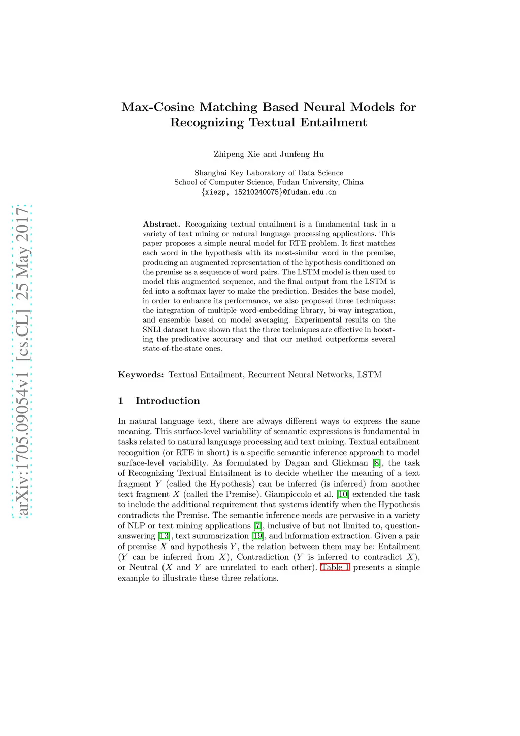 Max-Cosine Matching Based Neural Models for Recognizing Textual