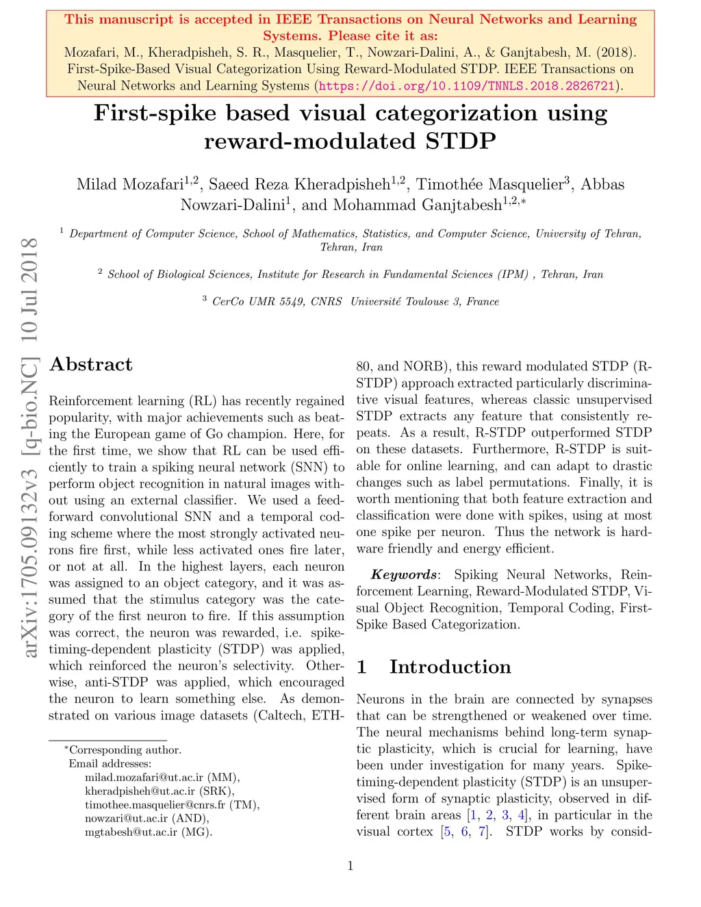 First-spike based visual categorization using reward-modulated STDP