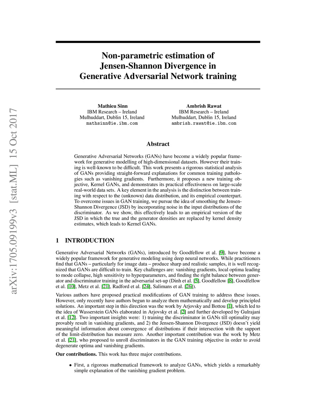 Generative Adversarial Networks (GANs) have become a widely popular framework for generative modelling of high-dimensional datasets. However their training is well-known to be difficult. This work presents a rigorous statistical analysis of GANs providing straight-forward explanations for common training pathologies such as vanishing gradients. Furthermore, it proposes a new training objective, Kernel GANs, and demonstrates its practical effectiveness on large-scale real-world data sets. A key element in the analysis is the distinction between training with respect to the (unknown) data distribution, and its empirical counterpart. To overcome issues in GAN training, we pursue the idea of smoothing the Jensen-Shannon Divergence (JSD) by incorporating noise in the input distributions of the discriminator. As we show, this effectively leads to an empirical version of the JSD in which the true and the generator densities are replaced by kernel density estimates, which leads to Kernel GANs.
