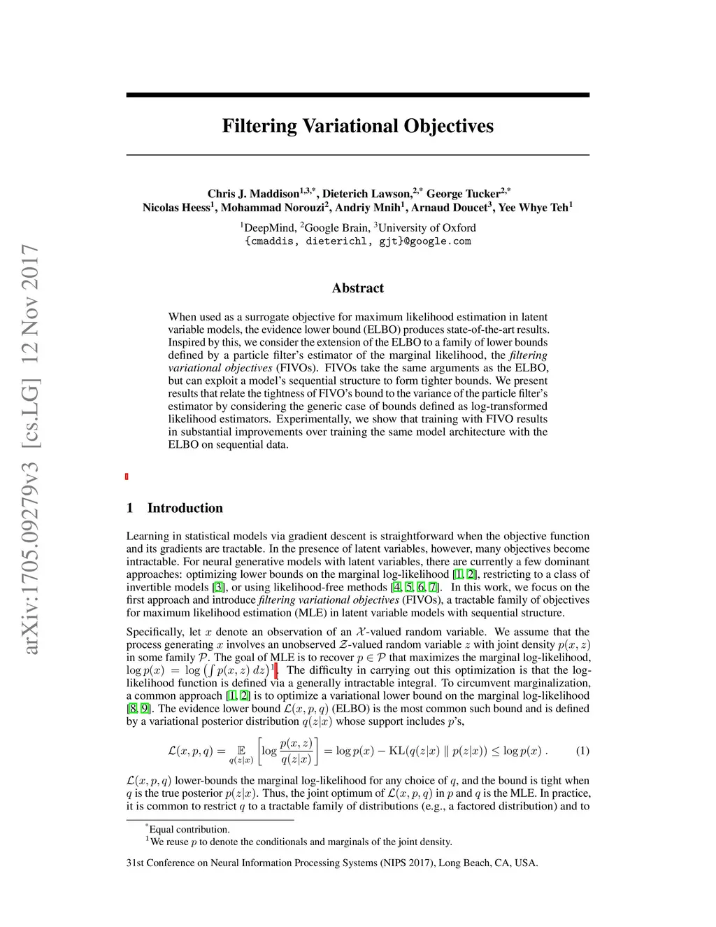 When used as a surrogate objective for maximum likelihood estimation in latent variable models, the evidence lower bound (ELBO) produces state-of-the-art results. Inspired by this, we consider the extension of the ELBO to a family of lower bounds defined by a particle filter's estimator of the marginal likelihood, the filtering variational objectives (FIVOs). FIVOs take the same arguments as the ELBO, but can exploit a model's sequential structure to form tighter bounds. We present results that relate the tightness of FIVO's bound to the variance of the particle filter's estimator by considering the generic case of bounds defined as log-transformed likelihood estimators. Experimentally, we show that training with FIVO results in substantial improvements over training the same model architecture with the ELBO on sequential data.