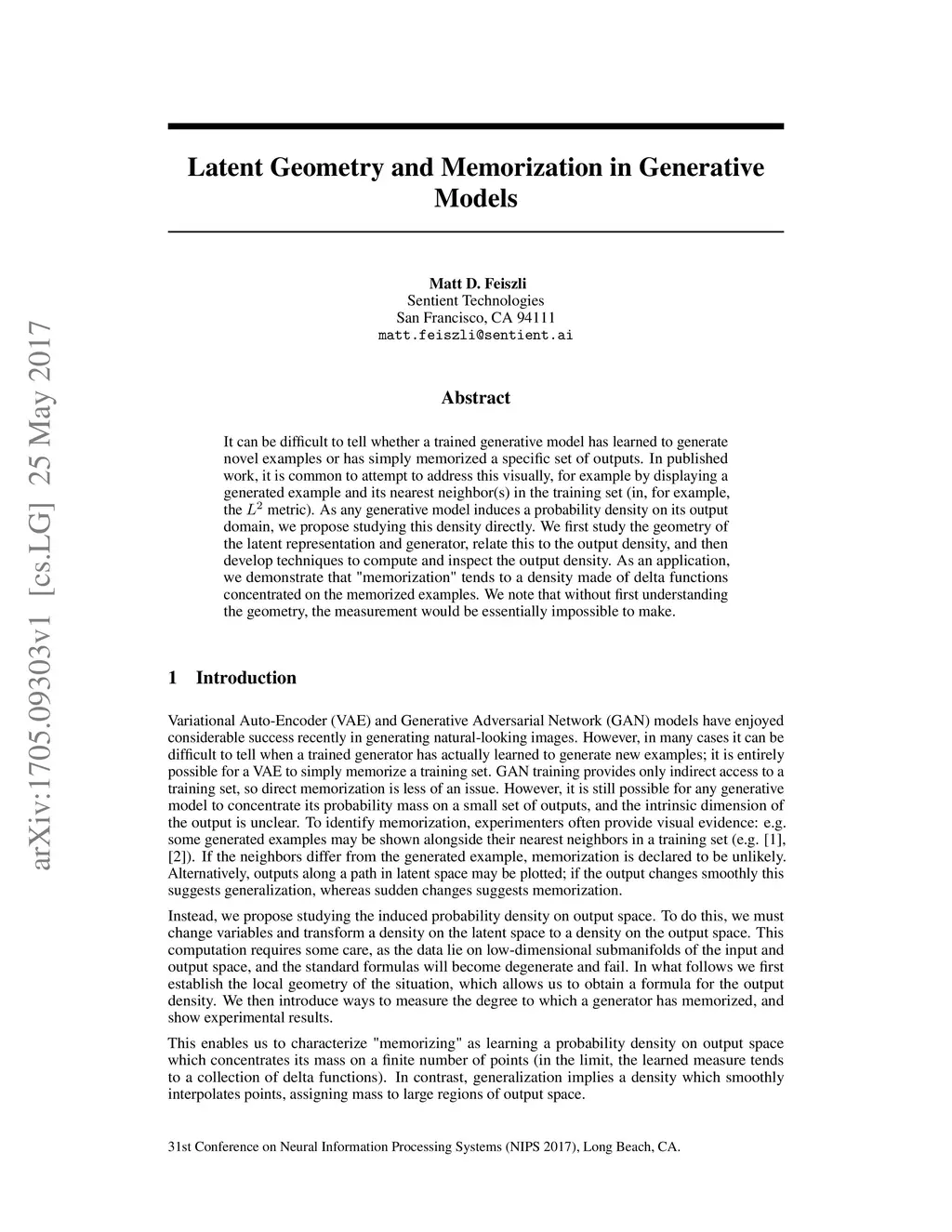 It can be difficult to tell whether a trained generative model has learned to generate novel examples or has simply memorized a specific set of outputs. In published work, it is common to attempt to address this visually, for example by displaying a generated example and its nearest neighbor(s) in the training set (in, for example, the L2 metric). As any generative model induces a probability density on its output domain, we propose studying this density directly. We first study the geometry of the latent representation and generator, relate this to the output density, and then develop techniques to compute and inspect the output density. As an application, we demonstrate that "memorization" tends to a density made of delta functions concentrated on the memorized examples. We note that without first understanding the geometry, the measurement would be essentially impossible to make.