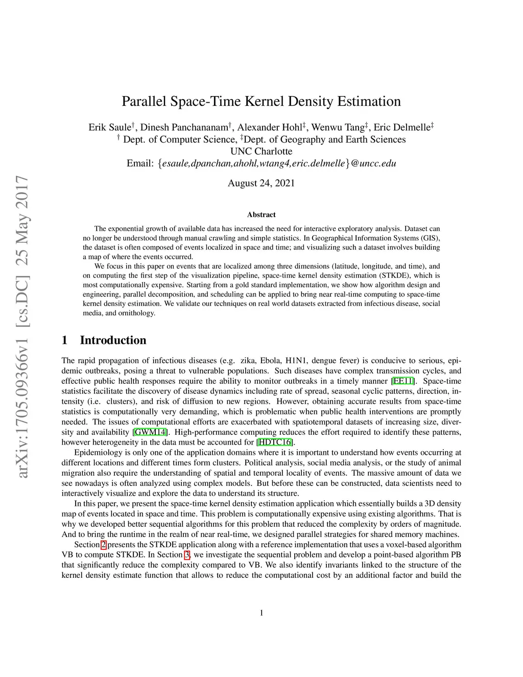 The exponential growth of available data has increased the need for interactive exploratory analysis. Dataset can no longer be understood through manual crawling and simple statistics. In Geographical Information Systems (GIS), the dataset is often composed of events localized in space and time; and visualizing such a dataset involves building a map of where the events occurred. We focus in this paper on events that are localized among three dimensions (latitude, longitude, and time), and on computing the first step of the visualization pipeline, space-time kernel density estimation (STKDE), which is most computationally expensive. Starting from a gold standard implementation, we show how algorithm design and engineering, parallel decomposition, and scheduling can be applied to bring near real-time computing to space-time kernel density estimation. We validate our techniques on real world datasets extracted from infectious disease, social media, and ornithology.