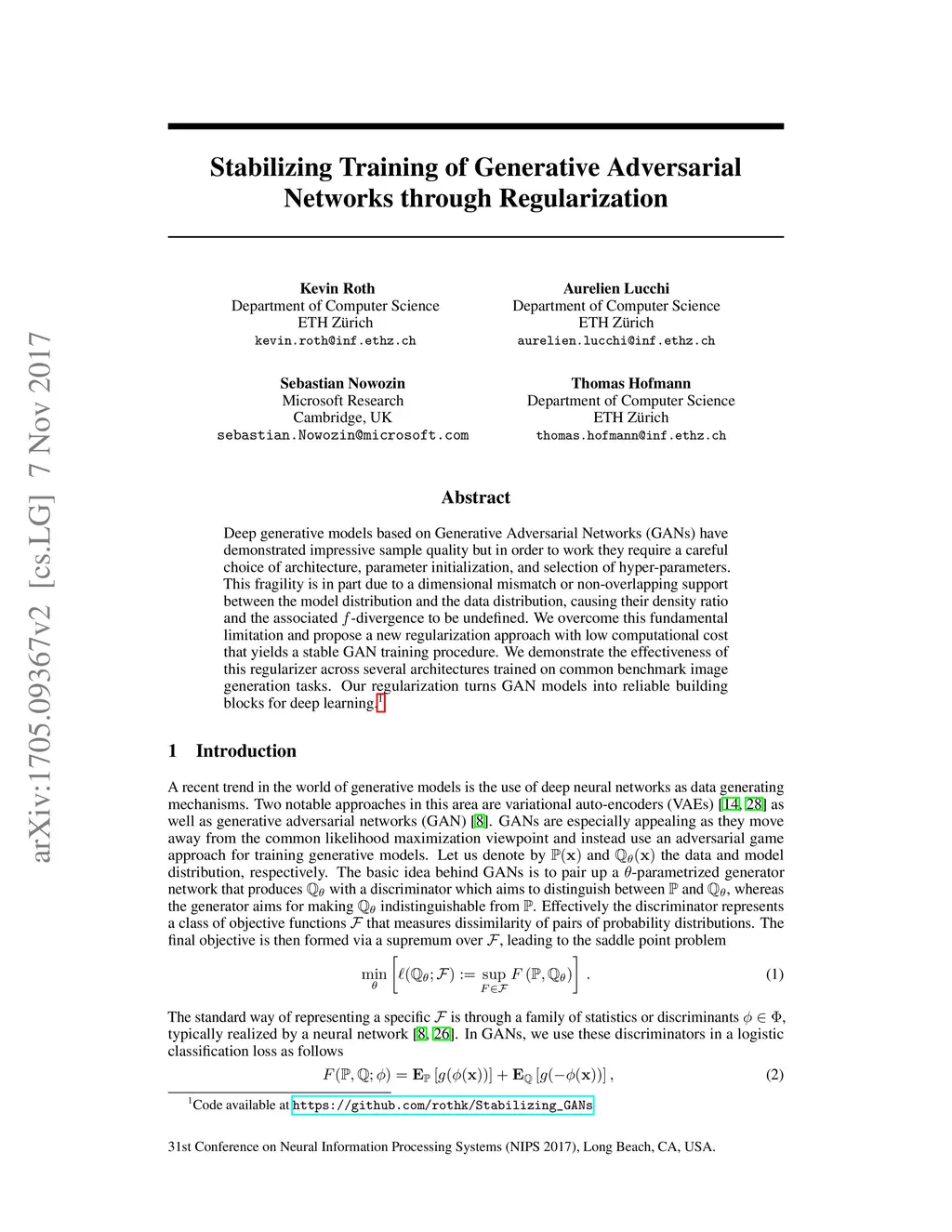 Deep generative models based on Generative Adversarial Networks (GANs) have demonstrated impressive sample quality but in order to work they require a careful choice of architecture, parameter initialization, and selection of hyper-parameters. This fragility is in part due to a dimensional mismatch or non-overlapping support between the model distribution and the data distribution, causing their density ratio and the associated f-divergence to be undefined. We overcome this fundamental limitation and propose a new regularization approach with low computational cost that yields a stable GAN training procedure. We demonstrate the effectiveness of this regularizer across several architectures trained on common benchmark image generation tasks. Our regularization turns GAN models into reliable building blocks for deep learning.