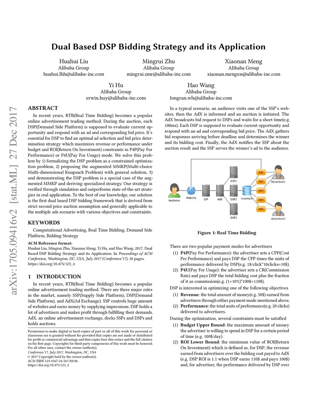 In recent years, RTB(Real Time Bidding) becomes a popular online advertisement trading method. During the auction, each DSP(Demand Side Platform) is supposed to evaluate current opportunity and respond with an ad and corresponding bid price. It's essential for DSP to find an optimal ad selection and bid price determination strategy which maximizes revenue or performance under budget and ROI(Return On Investment) constraints in P4P(Pay For Performance) or P4U(Pay For Usage) mode. We solve this problem by 1) formalizing the DSP problem as a constrained optimization problem, 2) proposing the augmented MMKP(Multi-choice Multi-dimensional Knapsack Problem) with general solution, 3) and demonstrating the DSP problem is a special case of the augmented MMKP and deriving specialized strategy. Our strategy is verified through simulation and outperforms state-of-the-art strategies in real application. To the best of our knowledge, our solution is the first dual based DSP bidding framework that is derived from strict second price auction assumption and generally applicable to the multiple ads scenario with various objectives and constraints.