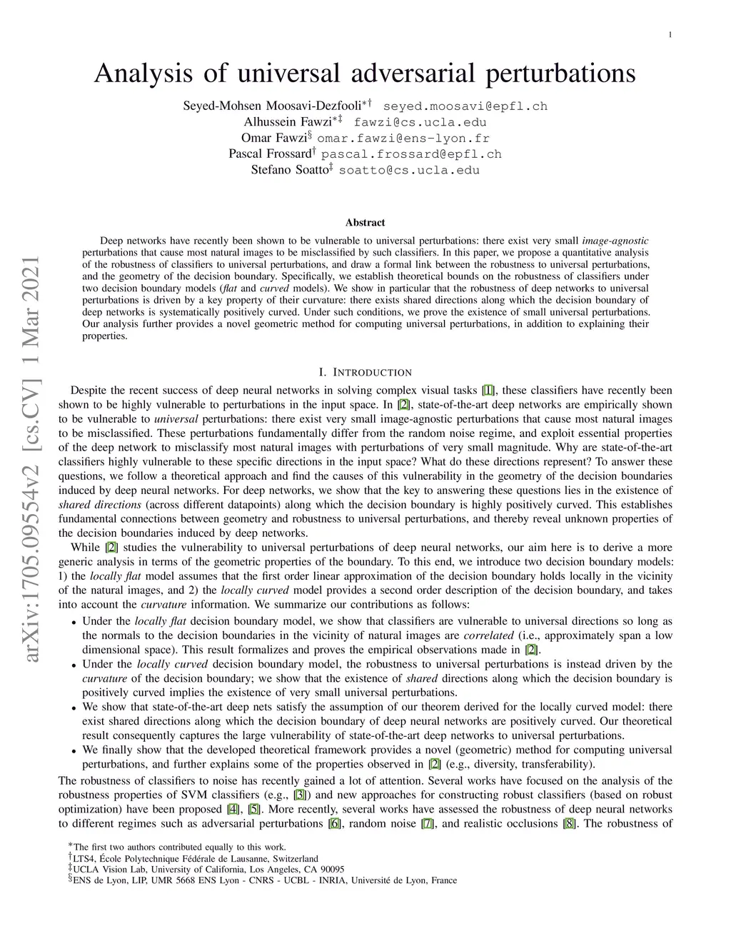 Deep networks have recently been shown to be vulnerable to universal perturbations: there exist very small image-agnostic perturbations that cause most natural images to be misclassified by such classifiers. In this paper, we propose the first quantitative analysis of the robustness of classifiers to universal perturbations, and draw a formal link between the robustness to universal perturbations, and the geometry of the decision boundary. Specifically, we establish theoretical bounds on the robustness of classifiers under two decision boundary models (flat and curved models). We show in particular that the robustness of deep networks to universal perturbations is driven by a key property of their curvature: there exists shared directions along which the decision boundary of deep networks is systematically positively curved. Under such conditions, we prove the existence of small universal perturbations. Our analysis further provides a novel geometric method for computing universal perturbations, in addition to explaining their properties.
