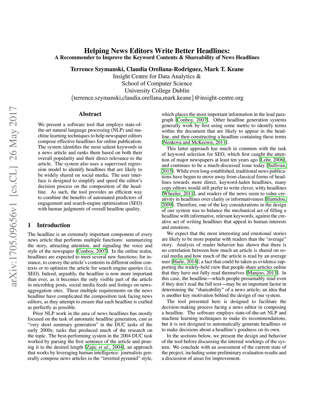 We present a software tool that employs state-of-the-art natural language processing (NLP) and machine learning techniques to help newspaper editors compose effective headlines for online publication. The system identifies the most salient keywords in a news article and ranks them based on both their overall popularity and their direct relevance to the article. The system also uses a supervised regression model to identify headlines that are likely to be widely shared on social media. The user interface is designed to simplify and speed the editor's decision process on the composition of the headline. As such, the tool provides an efficient way to combine the benefits of automated predictors of engagement and search-engine optimization (SEO) with human judgments of overall headline quality.