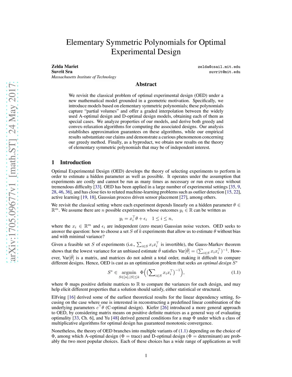 We revisit the classical problem of optimal experimental design (OED) under a new mathematical model grounded in a geometric motivation. Specifically, we introduce models based on elementary symmetric polynomials; these polynomials capture "partial volumes" and offer a graded interpolation between the widely used A-optimal design and D-optimal design models, obtaining each of them as special cases. We analyze properties of our models, and derive both greedy and convex-relaxation algorithms for computing the associated designs. Our analysis establishes approximation guarantees on these algorithms, while our empirical results substantiate our claims and demonstrate a curious phenomenon concerning our greedy method. Finally, as a byproduct, we obtain new results on the theory of elementary symmetric polynomials that may be of independent interest.