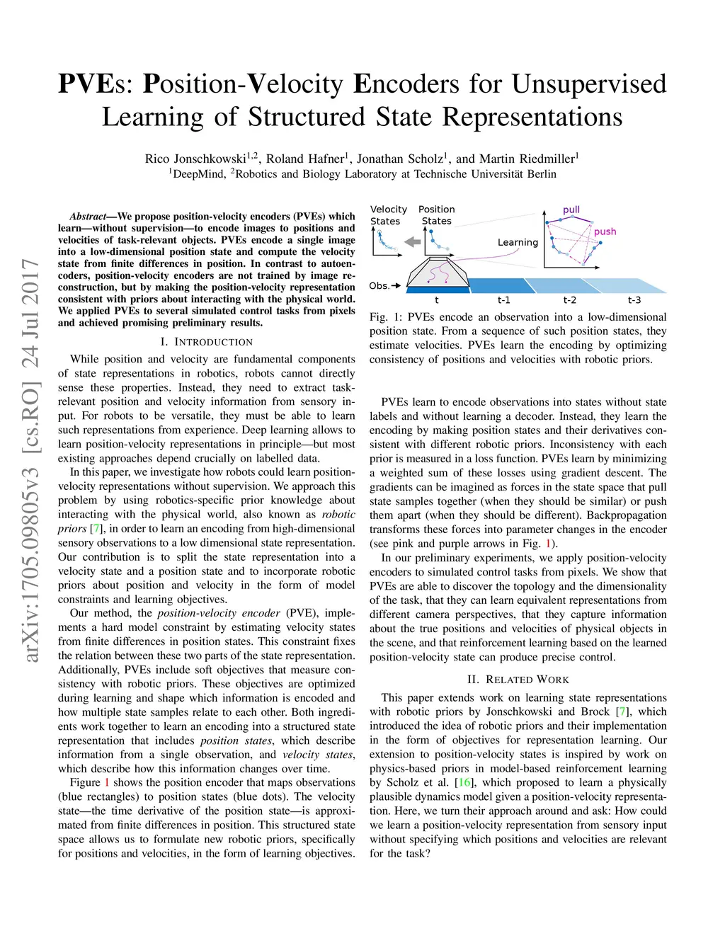 We propose position-velocity encoders (PVEs) which learn---without supervision---to encode images to positions and velocities of task-relevant objects. PVEs encode a single image into a low-dimensional position state and compute the velocity state from finite differences in position. In contrast to autoencoders, position-velocity encoders are not trained by image reconstruction, but by making the position-velocity representation consistent with priors about interacting with the physical world. We applied PVEs to several simulated control tasks from pixels and achieved promising preliminary results.