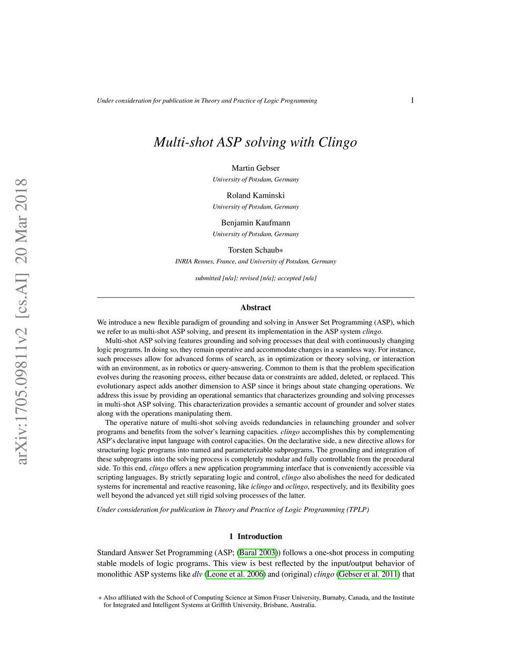 We introduce a new flexible paradigm of grounding and solving in Answer Set Programming (ASP), which we refer to as multi-shot ASP solving, and present its implementation in the ASP system clingo. Multi-shot ASP solving features grounding and solving processes that deal with continuously changing logic programs. In doing so, they remain operative and accommodate changes in a seamless way. For instance, such processes allow for advanced forms of search, as in optimization or theory solving, or interaction with an environment, as in robotics or query-answering. Common to them is that the problem specification evolves during the reasoning process, either because data or constraints are added, deleted, or replaced. This evolutionary aspect adds another dimension to ASP since it brings about state changing operations. We address this issue by providing an operational semantics that characterizes grounding and solving processes in multi-shot ASP solving. This characterization provides a semantic account of grounder and solver states along with the operations manipulating them. The operative nature of multi-shot solving avoids redundancies in relaunching grounder and solver programs and benefits from the solver's learning capacities. clingo accomplishes this by complementing ASP's declarative input language with control capacities. On the declarative side, a new directive allows for structuring logic programs into named and parameterizable subprograms. The grounding and integration of these subprograms into the solving process is completely modular and fully controllable from the procedural side. To this end, clingo offers a new application programming interface that is conveniently accessible via scripting languages.