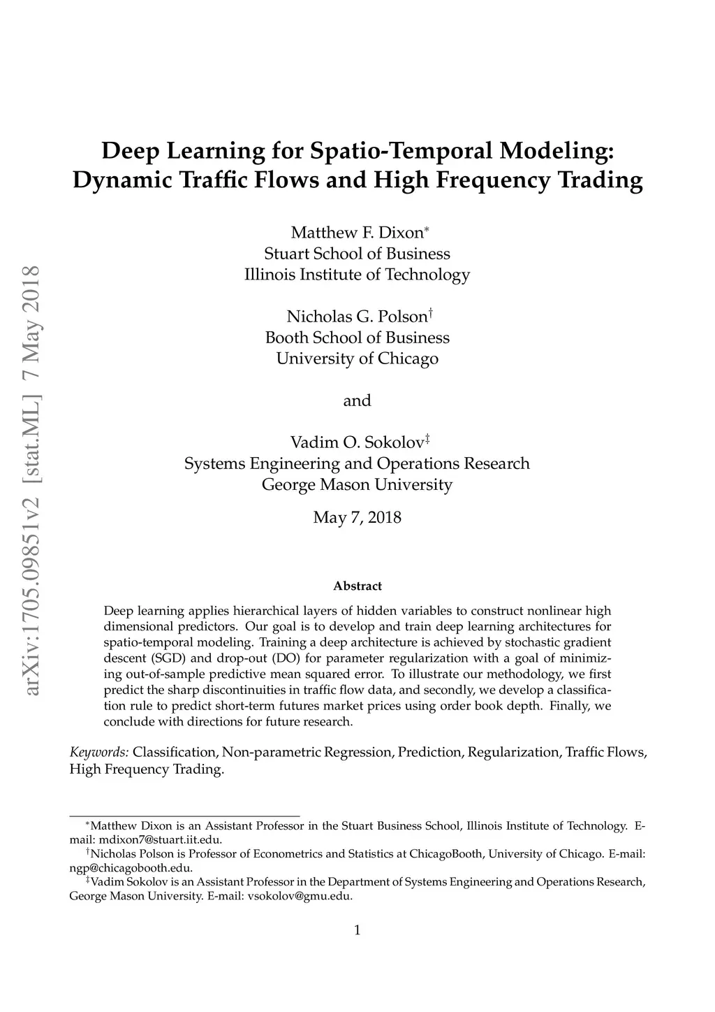 Deep learning applies hierarchical layers of hidden variables to construct nonlinear high dimensional predictors. Our goal is to develop and train deep learning architectures for spatio-temporal modeling. Training a deep architecture is achieved by stochastic gradient descent (SGD) and drop-out (DO) for parameter regularization with a goal of minimizing out-of-sample predictive mean squared error. To illustrate our methodology, we predict the sharp discontinuities in traffic flow data, and secondly, we develop a classification rule to predict short-term futures market prices as a function of the order book depth. Finally, we conclude with directions for future research.