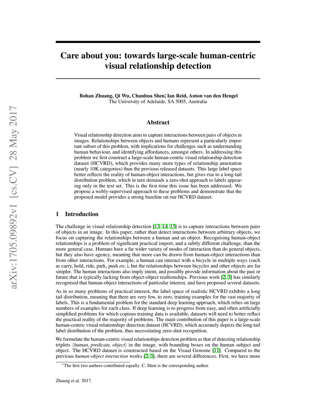 Visual relationship detection aims to capture interactions between pairs of objects in images. Relationships between objects and humans represent a particularly important subset of this problem, with implications for challenges such as understanding human behaviour, and identifying affordances, amongst others. In addressing this problem we first construct a large-scale human-centric visual relationship detection dataset (HCVRD), which provides many more types of relationship annotation (nearly 10K categories) than the previous released datasets. This large label space better reflects the reality of human-object interactions, but gives rise to a long-tail distribution problem, which in turn demands a zero-shot approach to labels appearing only in the test set. This is the first time this issue has been addressed. We propose a webly-supervised approach to these problems and demonstrate that the proposed model provides a strong baseline on our HCVRD dataset.