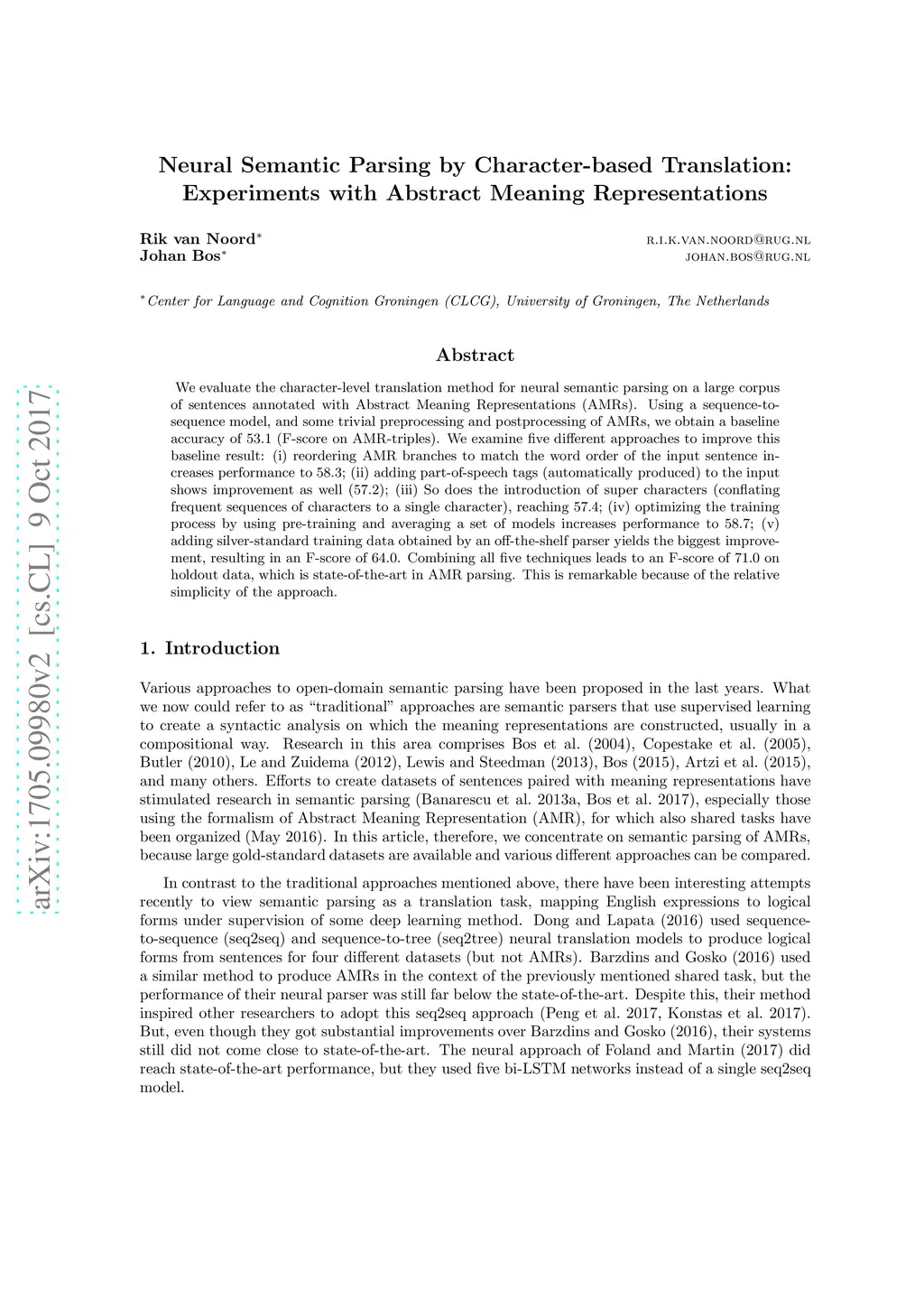 We evaluate the character-level translation method for neural semantic parsing on a large corpus of sentences annotated with Abstract Meaning Representations (AMRs). Using a sequence-to-sequence model, and some trivial preprocessing and postprocessing of AMRs, we obtain a baseline accuracy of 53.1 (F-score on AMR-triples). We examine five different approaches to improve this baseline result: (i) reordering AMR branches to match the word order of the input sentence increases performance to 58.3; (ii) adding part-of-speech tags (automatically produced) to the input shows improvement as well (57.2); (iii) So does the introduction of super characters (conflating frequent sequences of characters to a single character), reaching 57.4; (iv) optimizing the training process by using pre-training and averaging a set of models increases performance to 58.7; (v) adding silver-standard training data obtained by an off-the-shelf parser yields the biggest improvement, resulting in an F-score of 64.0. Combining all five techniques leads to an F-score of 71.0 on holdout data, which is state-of-the-art in AMR parsing. This is remarkable because of the relative simplicity of the approach.
