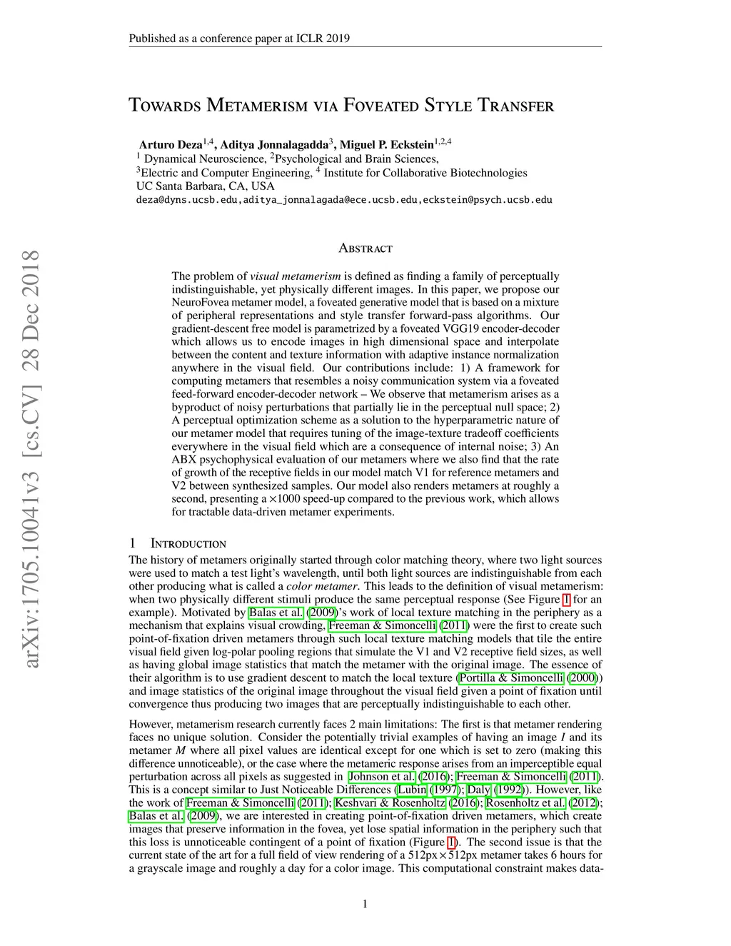 The problem of is defined as finding a family of perceptually indistinguishable, yet physically different images. In this paper, we propose our NeuroFovea metamer model, a foveated generative model that is based on a mixture of peripheral representations and style transfer forward-pass algorithms. Our gradient-descent free model is parametrized by a foveated VGG19 encoder-decoder which allows us to encode images in high dimensional space and interpolate between the content and texture information with adaptive instance normalization anywhere in the visual field. Our contributions include: 1) A framework for computing metamers that resembles a noisy communication system via a foveated feed-forward encoder-decoder network -- We observe that metamerism arises as a byproduct of noisy perturbations that partially lie in the perceptual null space; 2) A perceptual optimization scheme as a solution to the hyperparametric nature of our metamer model that requires tuning of the image-texture tradeoff coefficients everywhere in the visual field which are a consequence of internal noise; 3) An ABX psychophysical evaluation of our metamers where we also find that the rate of growth of the receptive fields in our model match V1 for reference metamers and V2 between synthesized samples. Our model also renders metamers at roughly a second, presenting a speed-up compared to the previous work, which allows for tractable data-driven metamer experiments.