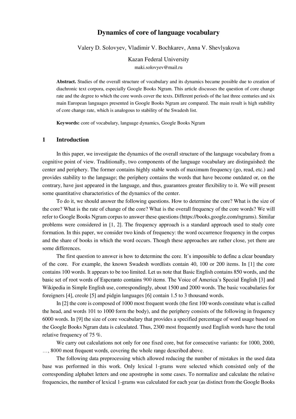 Studies of the overall structure of vocabulary and its dynamics became possible due to creation of diachronic text corpora, especially Google Books Ngram. This article discusses the question of core change rate and the degree to which the core words cover the texts. Different periods of the last three centuries and six main European languages presented in Google Books Ngram are compared. The main result is high stability of core change rate, which is analogous to stability of the Swadesh list.
