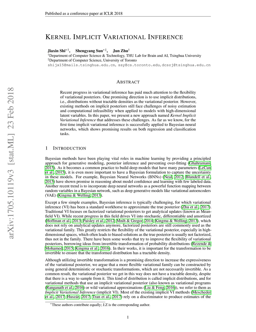 Recent progress in variational inference has paid much attention to the flexibility of variational posteriors. One promising direction is to use implicit distributions, i.e., distributions without tractable densities as the variational posterior. However, existing methods on implicit posteriors still face challenges of noisy estimation and computational infeasibility when applied to models with high-dimensional latent variables. In this paper, we present a new approach named Kernel Implicit Variational Inference that addresses these challenges. As far as we know, for the first time implicit variational inference is successfully applied to Bayesian neural networks, which shows promising results on both regression and classification tasks.