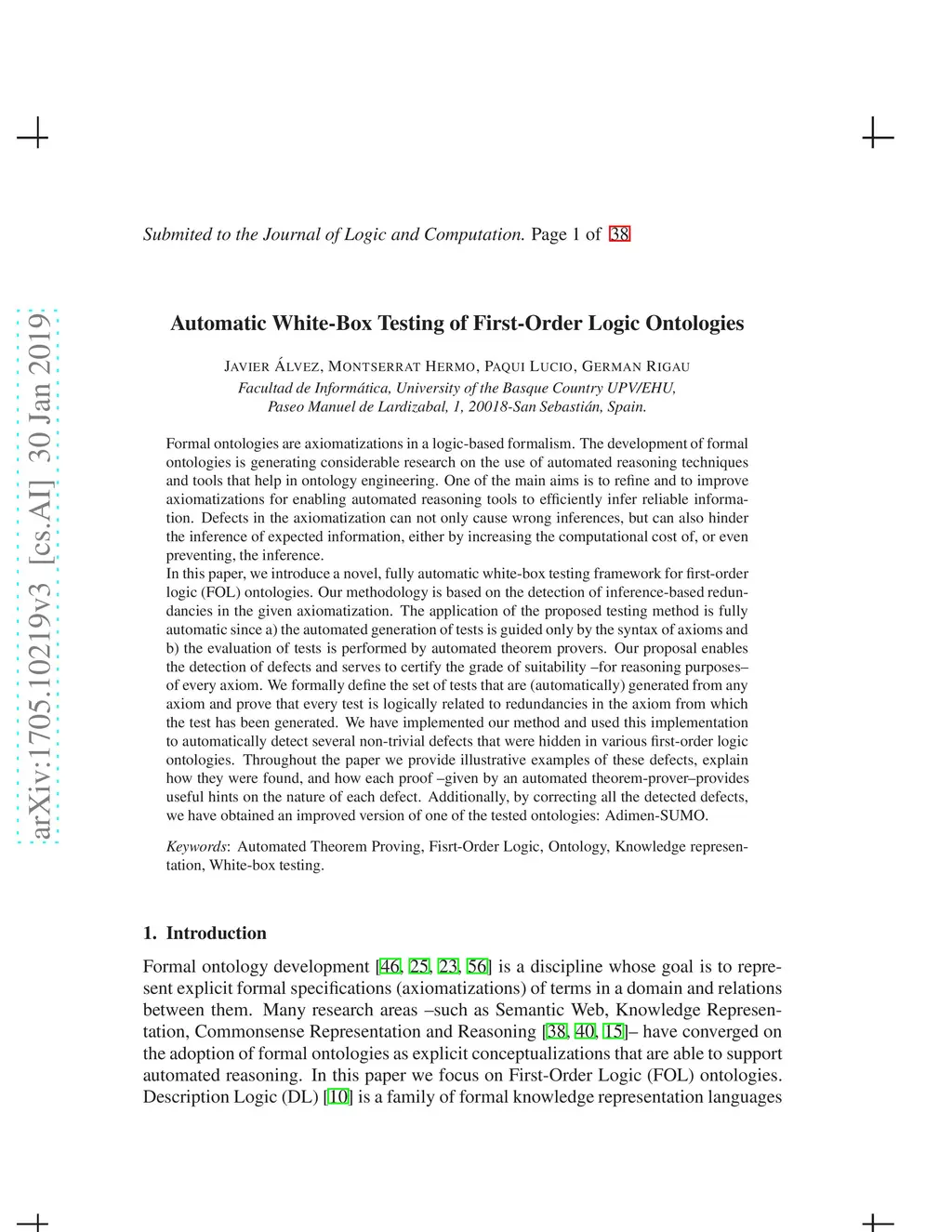 Formal ontologies are axiomatizations in a logic-based formalism. The development of formal ontologies, and their important role in the Semantic Web area, is generating considerable research on the use of automated reasoning techniques and tools that help in ontology engineering. One of the main aims is to refine and to improve axiomatizations for enabling automated reasoning tools to efficiently infer reliable information. Defects in the axiomatization can not only cause wrong inferences, but can also hinder the inference of expected information, either by increasing the computational cost of, or even preventing, the inference. In this paper, we introduce a novel, fully automatic white-box testing framework for first-order logic ontologies. Our methodology is based on the detection of inference-based redundancies in the given axiomatization. The application of the proposed testing method is fully automatic since a) the automated generation of tests is guided only by the syntax of axioms and b) the evaluation of tests is performed by automated theorem provers. Our proposal enables the detection of defects and serves to certify the grade of suitability --for reasoning purposes-- of every axiom. We formally define the set of tests that are generated from any axiom and prove that every test is logically related to redundancies in the axiom from which the test has been generated. We have implemented our method and used this implementation to automatically detect several non-trivial defects that were hidden in various first-order logic ontologies. Throughout the paper we provide illustrative examples of these defects, explain how they were found, and how each proof --given by an automated theorem-prover-- provides useful hints on the nature of each defect. Additionally, by correcting all the detected defects, we have obtained an improved version of one of the tested ontologies: Adimen-SUMO.