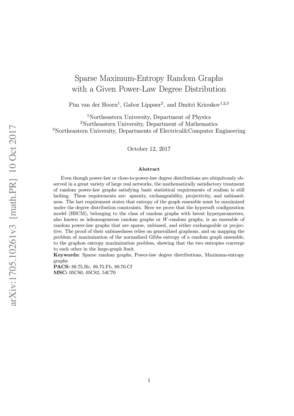 Even though power-law or close-to-power-law degree distributions are ubiquitously observed in a great variety of large real networks, the mathematically satisfactory treatment of random power-law graphs satisfying basic statistical requirements of realism is still lacking. These requirements are: sparsity, exchangeability, projectivity, and unbiasedness. The last requirement states that entropy of the graph ensemble must be maximized under the degree distribution constraints. Here we prove that the hypersoft configuration model (HSCM), belonging to the class of random graphs with latent hyperparameters, also known as inhomogeneous random graphs or -random graphs, satisfies all these requirements. The proof relies on generalized graphons, and on mapping the problem of maximization of the normalized Gibbs entropy of a random graph ensemble, to the graphon entropy maximization problem, showing that the two entropies converge to each other in the large-graph limit.