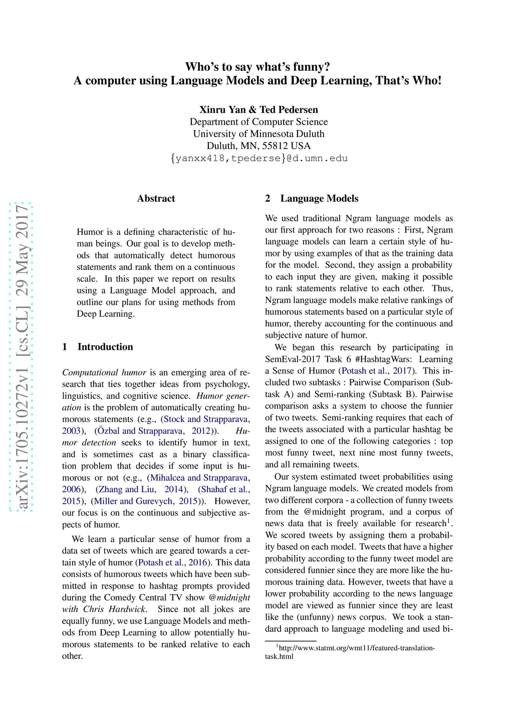 Humor is a defining characteristic of human beings. Our goal is to develop methods that automatically detect humorous statements and rank them on a continuous scale. In this paper we report on results using a Language Model approach, and outline our plans for using methods from Deep Learning.