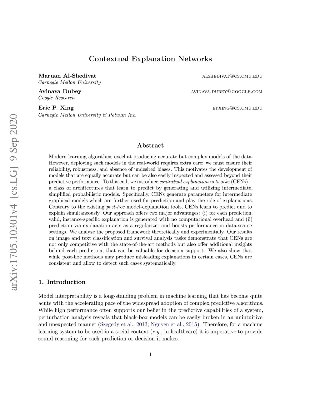Modern learning algorithms excel at producing accurate but complex models of the data. However, deploying such models in the real-world requires extra care: we must ensure their reliability, robustness, and absence of undesired biases. This motivates the development of models that are equally accurate but can be also easily inspected and assessed beyond their predictive performance. To this end, we introduce contextual explanation networks (CEN)---a class of architectures that learn to predict by generating and utilizing intermediate, simplified probabilistic models. Specifically, CENs generate parameters for intermediate graphical models which are further used for prediction and play the role of explanations. Contrary to the existing post-hoc model-explanation tools, CENs learn to predict and to explain simultaneously. Our approach offers two major advantages: (i) for each prediction valid, instance-specific explanation is generated with no computational overhead and (ii) prediction via explanation acts as a regularizer and boosts performance in data-scarce settings. We analyze the proposed framework theoretically and experimentally. Our results on image and text classification and survival analysis tasks demonstrate that CENs are not only competitive with the state-of-the-art methods but also offer additional insights behind each prediction, that can be valuable for decision support. We also show that while post-hoc methods may produce misleading explanations in certain cases, CENs are consistent and allow to detect such cases systematically.