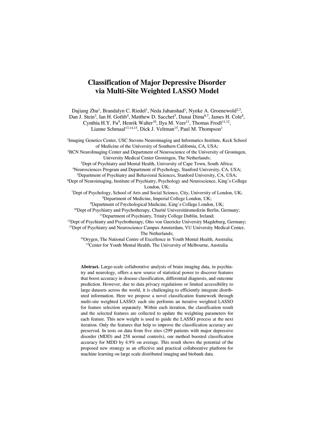 Large-scale collaborative analysis of brain imaging data, in psychiatry and neu-rology, offers a new source of statistical power to discover features that boost ac-curacy in disease classification, differential diagnosis, and outcome prediction. However, due to data privacy regulations or limited accessibility to large datasets across the world, it is challenging to efficiently integrate distributed information. Here we propose a novel classification framework through multi-site weighted LASSO: each site performs an iterative weighted LASSO for feature selection separately. Within each iteration, the classification result and the selected features are collected to update the weighting parameters for each feature. This new weight is used to guide the LASSO process at the next iteration. Only the fea-tures that help to improve the classification accuracy are preserved. In tests on da-ta from five sites (299 patients with major depressive disorder (MDD) and 258 normal controls), our method boosted classification accuracy for MDD by 4.9% on average. This result shows the potential of the proposed new strategy as an ef-fective and practical collaborative platform for machine learning on large scale distributed imaging and biobank data.