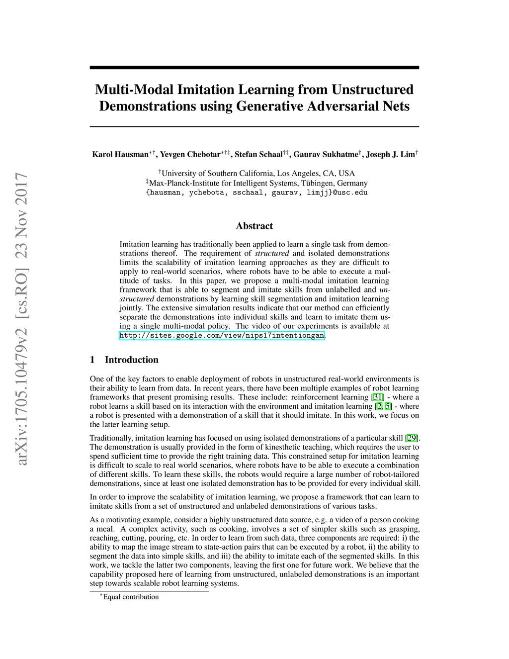 Imitation learning has traditionally been applied to learn a single task from demonstrations thereof. The requirement of structured and isolated demonstrations limits the scalability of imitation learning approaches as they are difficult to apply to real-world scenarios, where robots have to be able to execute a multitude of tasks. In this paper, we propose a multi-modal imitation learning framework that is able to segment and imitate skills from unlabelled and unstructured demonstrations by learning skill segmentation and imitation learning jointly. The extensive simulation results indicate that our method can efficiently separate the demonstrations into individual skills and learn to imitate them using a single multi-modal policy. The video of our experiments is available at http://sites.google.com/view/nips17intentiongan