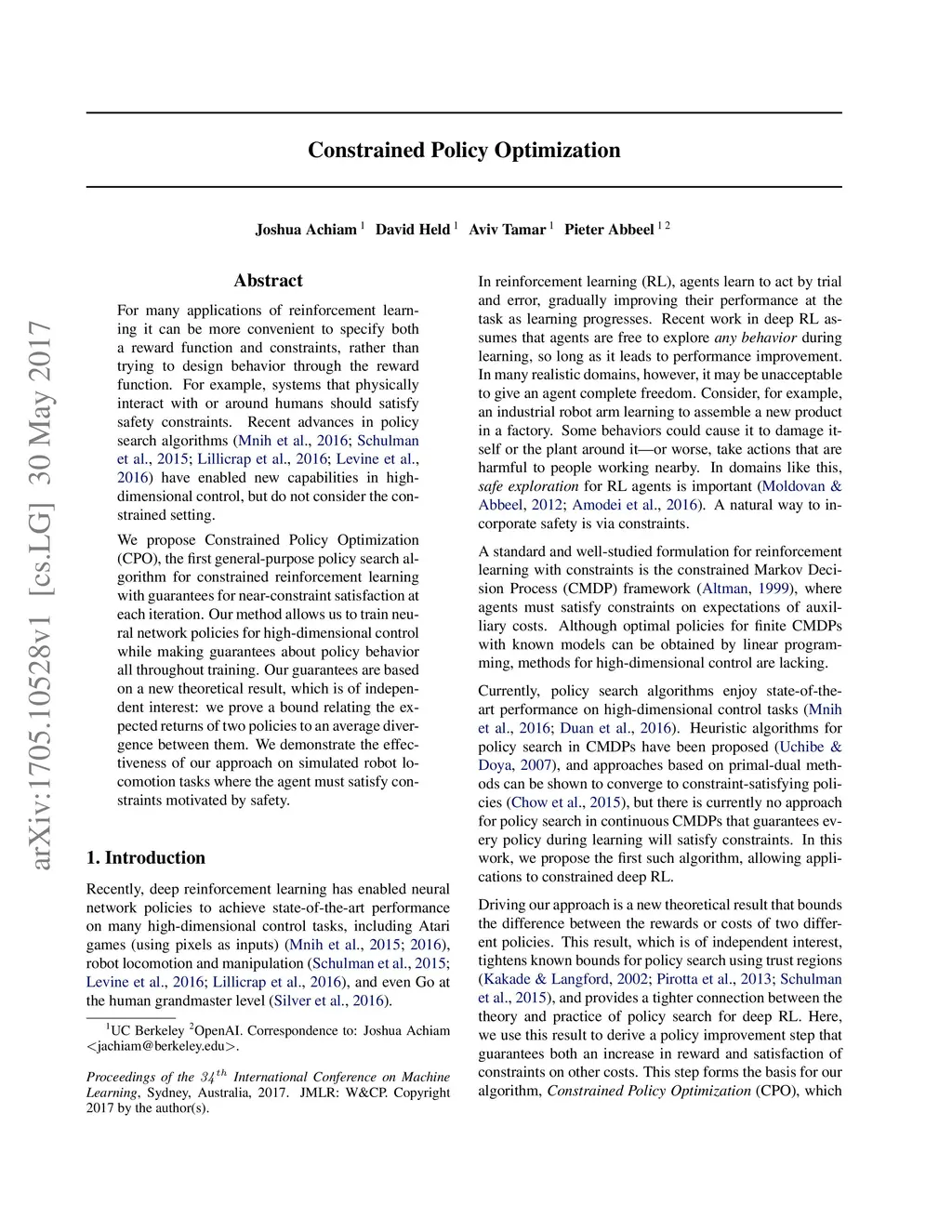 For many applications of reinforcement learning it can be more convenient to specify both a reward function and constraints, rather than trying to design behavior through the reward function. For example, systems that physically interact with or around humans should satisfy safety constraints. Recent advances in policy search algorithms (Mnih et al., 2016, Schulman et al., 2015, Lillicrap et al., 2016, Levine et al., 2016) have enabled new capabilities in high-dimensional control, but do not consider the constrained setting. We propose Constrained Policy Optimization (CPO), the first general-purpose policy search algorithm for constrained reinforcement learning with guarantees for near-constraint satisfaction at each iteration. Our method allows us to train neural network policies for high-dimensional control while making guarantees about policy behavior all throughout training. Our guarantees are based on a new theoretical result, which is of independent interest: we prove a bound relating the expected returns of two policies to an average divergence between them. We demonstrate the effectiveness of our approach on simulated robot locomotion tasks where the agent must satisfy constraints motivated by safety.