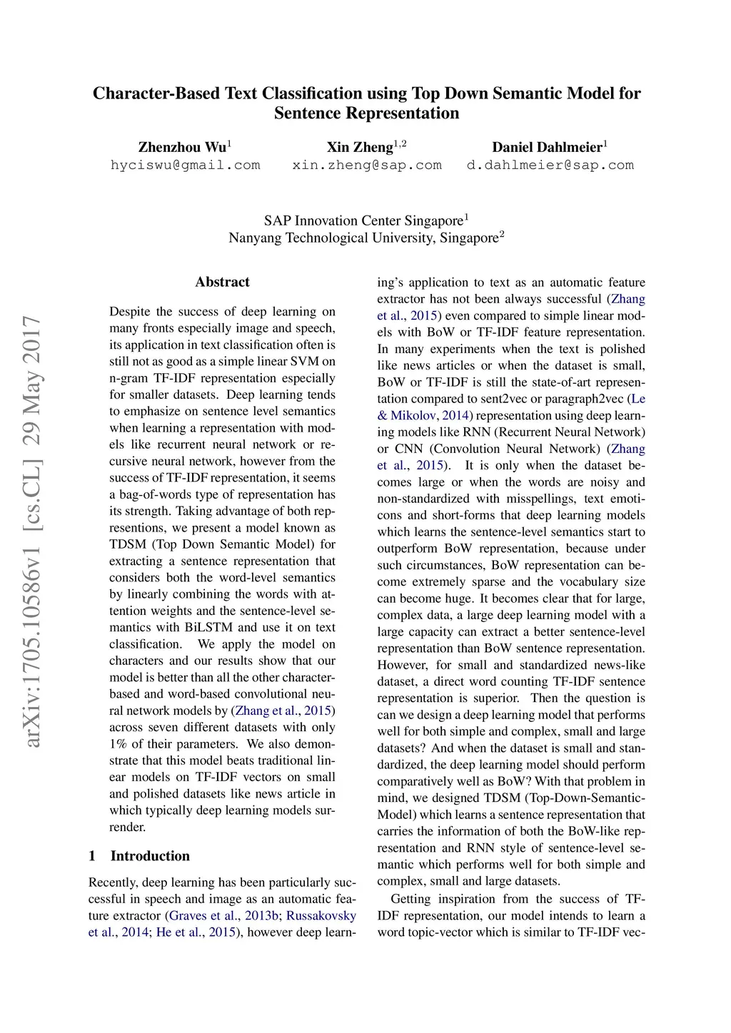 Despite the success of deep learning on many fronts especially image and speech, its application in text classification often is still not as good as a simple linear SVM on n-gram TF-IDF representation especially for smaller datasets. Deep learning tends to emphasize on sentence level semantics when learning a representation with models like recurrent neural network or recursive neural network, however from the success of TF-IDF representation, it seems a bag-of-words type of representation has its strength. Taking advantage of both representions, we present a model known as TDSM (Top Down Semantic Model) for extracting a sentence representation that considers both the word-level semantics by linearly combining the words with attention weights and the sentence-level semantics with BiLSTM and use it on text classification. We apply the model on characters and our results show that our model is better than all the other character-based and word-based convolutional neural network models by \cite{zhang15} across seven different datasets with only 1\% of their parameters. We also demonstrate that this model beats traditional linear models on TF-IDF vectors on small and polished datasets like news article in which typically deep learning models surrender.