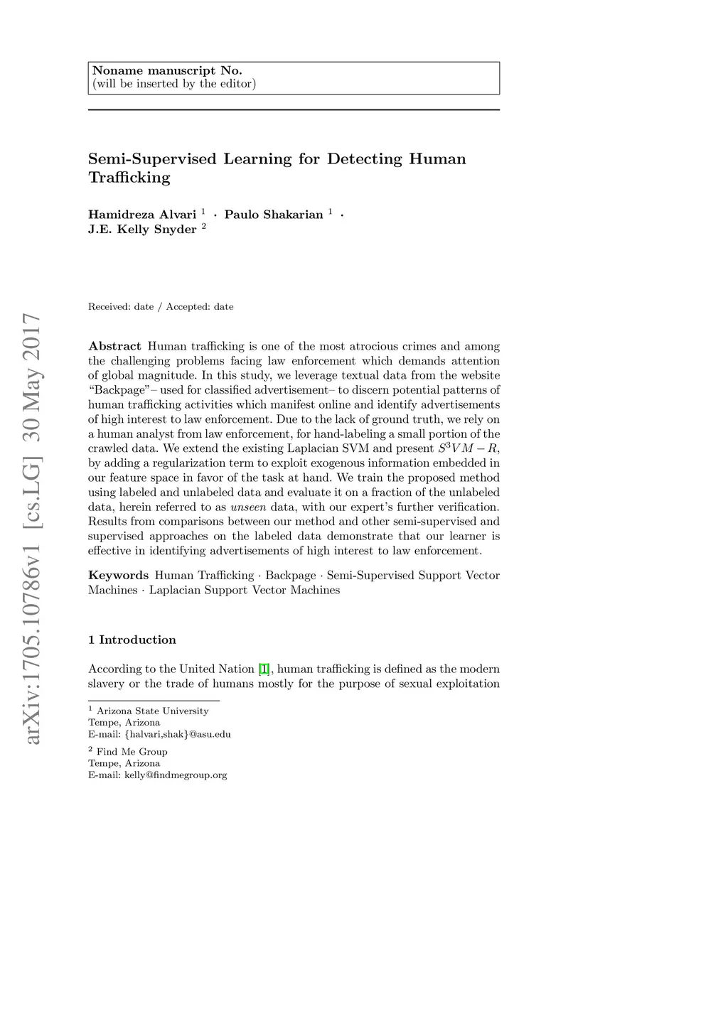 Human trafficking is one of the most atrocious crimes and among the challenging problems facing law enforcement which demands attention of global magnitude. In this study, we leverage textual data from the website "Backpage"- used for classified advertisement- to discern potential patterns of human trafficking activities which manifest online and identify advertisements of high interest to law enforcement. Due to the lack of ground truth, we rely on a human analyst from law enforcement, for hand-labeling a small portion of the crawled data. We extend the existing Laplacian SVM and present S3VM-R, by adding a regularization term to exploit exogenous information embedded in our feature space in favor of the task at hand. We train the proposed method using labeled and unlabeled data and evaluate it on a fraction of the unlabeled data, herein referred to as unseen data, with our expert's further verification. Results from comparisons between our method and other semi-supervised and supervised approaches on the labeled data demonstrate that our learner is effective in identifying advertisements of high interest to law enforcement