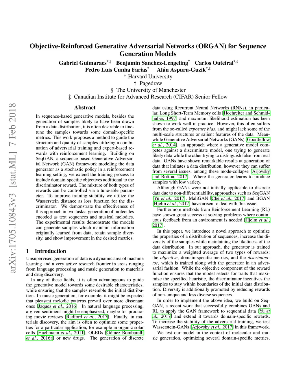 Objective-Reinforced Generative Adversarial Networks (ORGAN) for