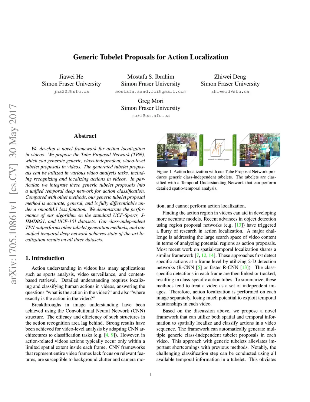 We develop a novel framework for action localization in videos. We propose the Tube Proposal Network (TPN), which can generate generic, class-independent, video-level tubelet proposals in videos. The generated tubelet proposals can be utilized in various video analysis tasks, including recognizing and localizing actions in videos. In particular, we integrate these generic tubelet proposals into a unified temporal deep network for action classification. Compared with other methods, our generic tubelet proposal method is accurate, general, and is fully differentiable under a smoothL1 loss function. We demonstrate the performance of our algorithm on the standard UCF-Sports, J-HMDB21, and UCF-101 datasets. Our class-independent TPN outperforms other tubelet generation methods, and our unified temporal deep network achieves state-of-the-art localization results on all three datasets.
