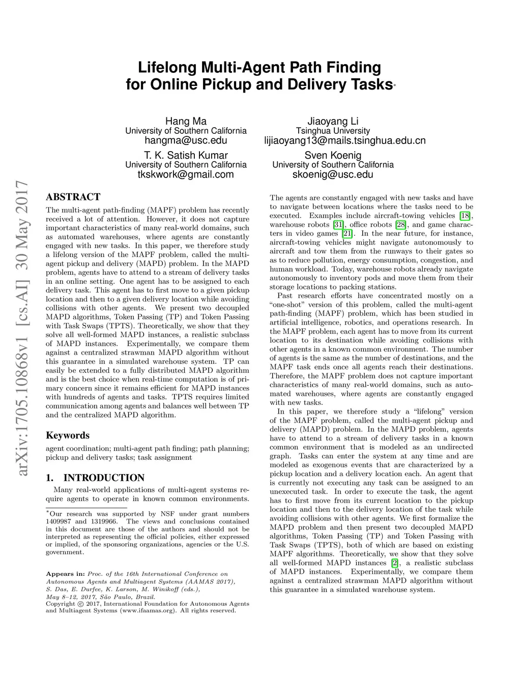 The multi-agent path-finding (MAPF) problem has recently received a lot of attention. However, it does not capture important characteristics of many real-world domains, such as automated warehouses, where agents are constantly engaged with new tasks. In this paper, we therefore study a lifelong version of the MAPF problem, called the multi-agent pickup and delivery (MAPD) problem. In the MAPD problem, agents have to attend to a stream of delivery tasks in an online setting. One agent has to be assigned to each delivery task. This agent has to first move to a given pickup location and then to a given delivery location while avoiding collisions with other agents. We present two decoupled MAPD algorithms, Token Passing (TP) and Token Passing with Task Swaps (TPTS). Theoretically, we show that they solve all well-formed MAPD instances, a realistic subclass of MAPD instances. Experimentally, we compare them against a centralized strawman MAPD algorithm without this guarantee in a simulated warehouse system. TP can easily be extended to a fully distributed MAPD algorithm and is the best choice when real-time computation is of primary concern since it remains efficient for MAPD instances with hundreds of agents and tasks. TPTS requires limited communication among agents and balances well between TP and the centralized MAPD algorithm.