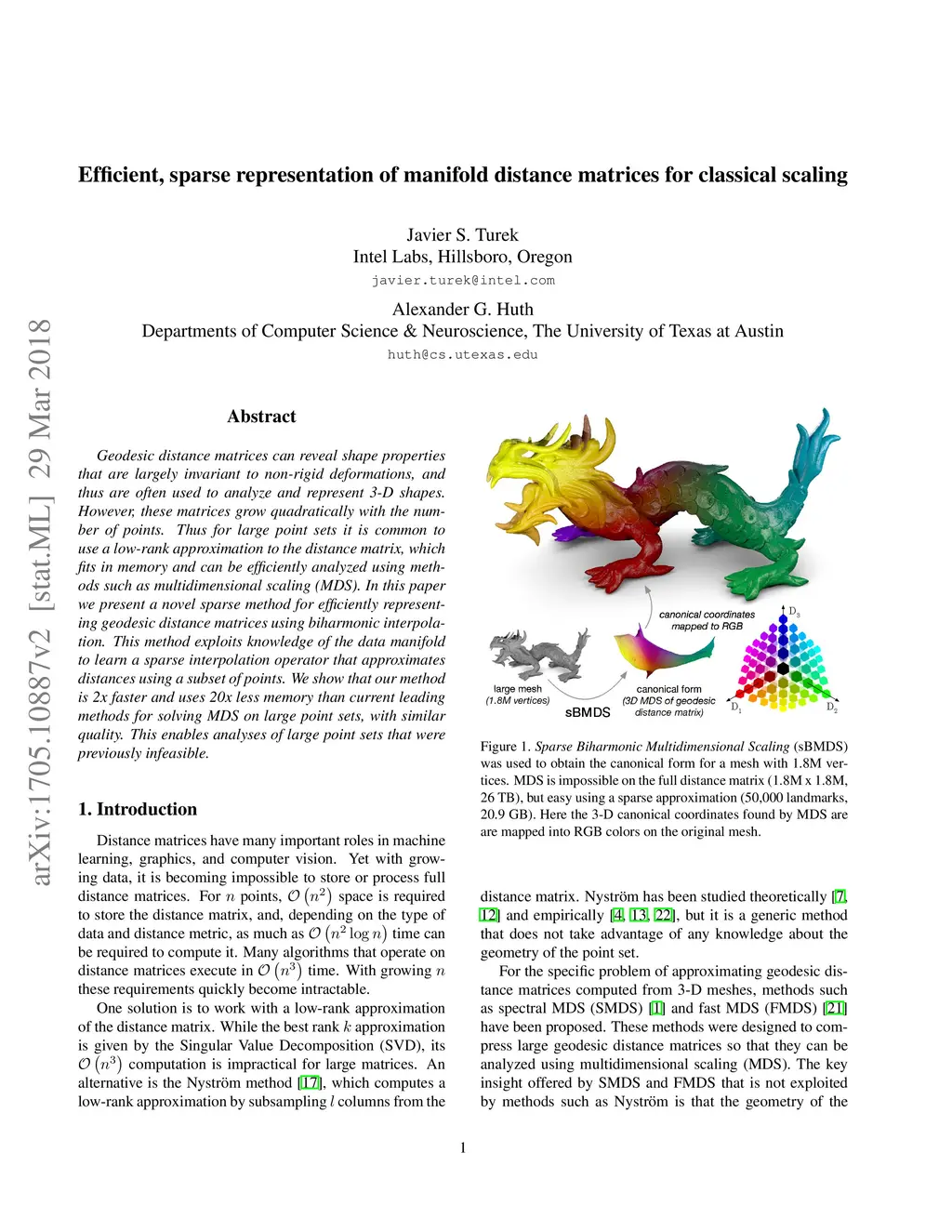 Geodesic distance matrices can reveal shape properties that are largely invariant to non-rigid deformations, and thus are often used to analyze and represent 3-D shapes. However, these matrices grow quadratically with the number of points. Thus for large point sets it is common to use a low-rank approximation to the distance matrix, which fits in memory and can be efficiently analyzed using methods such as multidimensional scaling (MDS). In this paper we present a novel sparse method for efficiently representing geodesic distance matrices using biharmonic interpolation. This method exploits knowledge of the data manifold to learn a sparse interpolation operator that approximates distances using a subset of points. We show that our method is 2x faster and uses 20x less memory than current leading methods for solving MDS on large point sets, with similar quality. This enables analyses of large point sets that were previously infeasible.