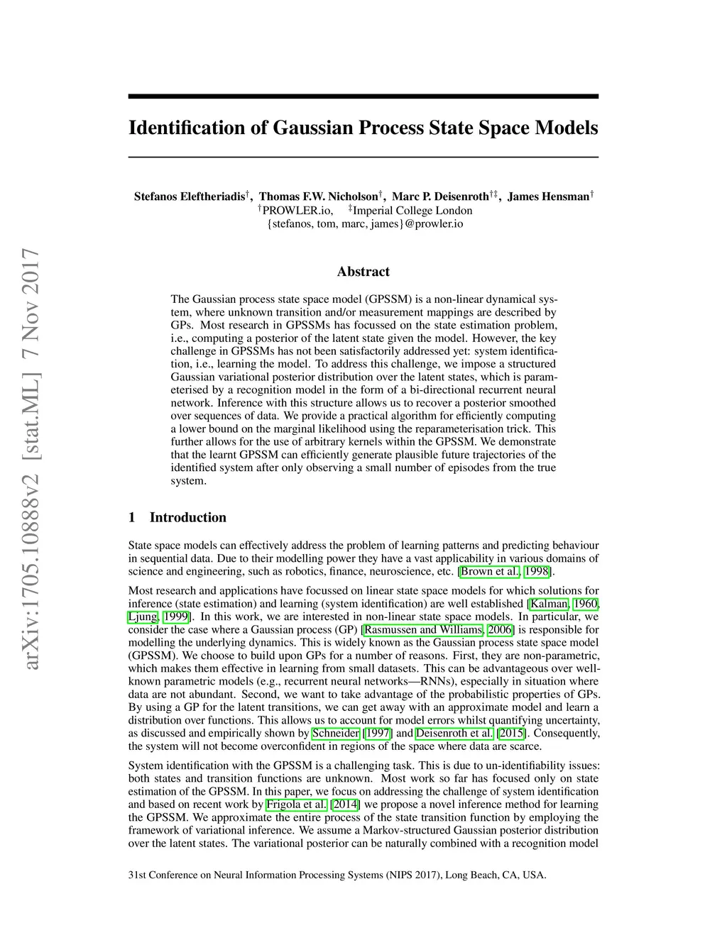 The Gaussian process state space model (GPSSM) is a non-linear dynamical system, where unknown transition and/or measurement mappings are described by GPs. Most research in GPSSMs has focussed on the state estimation problem, i.e., computing a posterior of the latent state given the model. However, the key challenge in GPSSMs has not been satisfactorily addressed yet: system identification, i.e., learning the model. To address this challenge, we impose a structured Gaussian variational posterior distribution over the latent states, which is parameterised by a recognition model in the form of a bi-directional recurrent neural network. Inference with this structure allows us to recover a posterior smoothed over sequences of data. We provide a practical algorithm for efficiently computing a lower bound on the marginal likelihood using the reparameterisation trick. This further allows for the use of arbitrary kernels within the GPSSM. We demonstrate that the learnt GPSSM can efficiently generate plausible future trajectories of the identified system after only observing a small number of episodes from the true system.