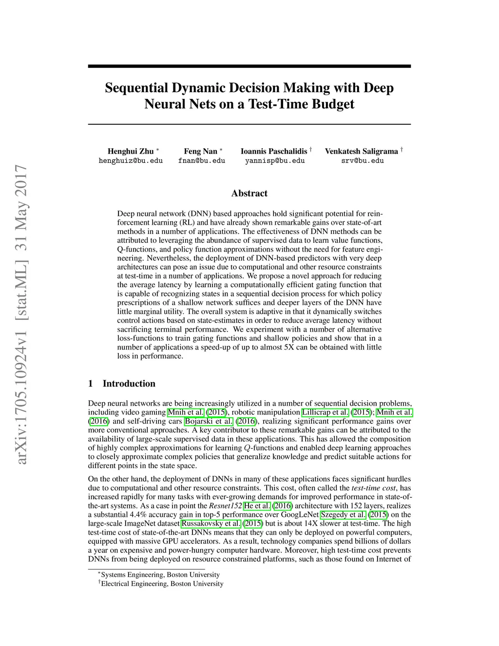 Deep neural network (DNN) based approaches hold significant potential for reinforcement learning (RL) and have already shown remarkable gains over state-of-art methods in a number of applications. The effectiveness of DNN methods can be attributed to leveraging the abundance of supervised data to learn value functions, Q-functions, and policy function approximations without the need for feature engineering. Nevertheless, the deployment of DNN-based predictors with very deep architectures can pose an issue due to computational and other resource constraints at test-time in a number of applications. We propose a novel approach for reducing the average latency by learning a computationally efficient gating function that is capable of recognizing states in a sequential decision process for which policy prescriptions of a shallow network suffices and deeper layers of the DNN have little marginal utility. The overall system is adaptive in that it dynamically switches control actions based on state-estimates in order to reduce average latency without sacrificing terminal performance. We experiment with a number of alternative loss-functions to train gating functions and shallow policies and show that in a number of applications a speed-up of up to almost 5X can be obtained with little loss in performance.
