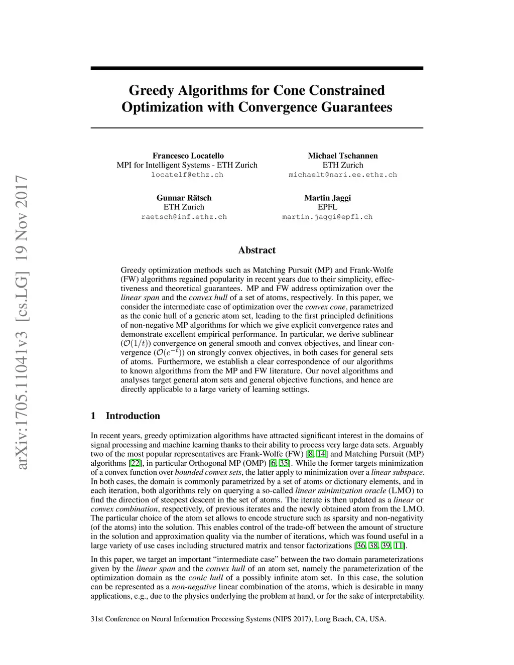 Greedy optimization methods such as Matching Pursuit (MP) and Frank-Wolfe (FW) algorithms regained popularity in recent years due to their simplicity, effectiveness and theoretical guarantees. MP and FW address optimization over the linear span and the convex hull of a set of atoms, respectively. In this paper, we consider the intermediate case of optimization over the convex cone, parametrized as the conic hull of a generic atom set, leading to the first principled definitions of non-negative MP algorithms for which we give explicit convergence rates and demonstrate excellent empirical performance. In particular, we derive sublinear () convergence on general smooth and convex objectives, and linear convergence () on strongly convex objectives, in both cases for general sets of atoms. Furthermore, we establish a clear correspondence of our algorithms to known algorithms from the MP and FW literature. Our novel algorithms and analyses target general atom sets and general objective functions, and hence are directly applicable to a large variety of learning settings.