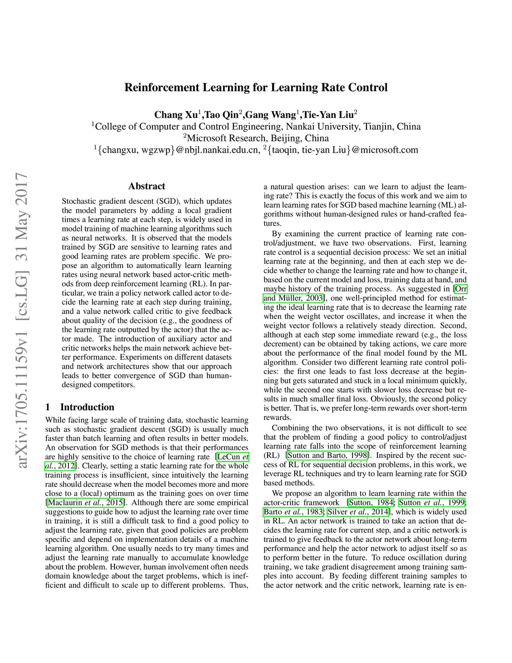 Stochastic gradient descent (SGD), which updates the model parameters by adding a local gradient times a learning rate at each step, is widely used in model training of machine learning algorithms such as neural networks. It is observed that the models trained by SGD are sensitive to learning rates and good learning rates are problem specific. We propose an algorithm to automatically learn learning rates using neural network based actor-critic methods from deep reinforcement learning (RL).In particular, we train a policy network called actor to decide the learning rate at each step during training, and a value network called critic to give feedback about quality of the decision (e.g., the goodness of the learning rate outputted by the actor) that the actor made. The introduction of auxiliary actor and critic networks helps the main network achieve better performance. Experiments on different datasets and network architectures show that our approach leads to better convergence of SGD than human-designed competitors.