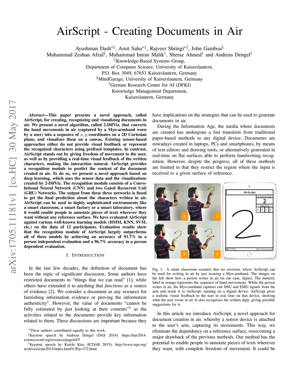 This paper presents a novel approach, called AirScript, for creating, recognizing and visualizing documents in air. We present a novel algorithm, called 2-DifViz, that converts the hand movements in air (captured by a Myo-armband worn by a user) into a sequence of x, y coordinates on a 2D Cartesian plane, and visualizes them on a canvas. Existing sensor-based approaches either do not provide visual feedback or represent the recognized characters using prefixed templates. In contrast, AirScript stands out by giving freedom of movement to the user, as well as by providing a real-time visual feedback of the written characters, making the interaction natural. AirScript provides a recognition module to predict the content of the document created in air. To do so, we present a novel approach based on deep learning, which uses the sensor data and the visualizations created by 2-DifViz. The recognition module consists of a Convolutional Neural Network (CNN) and two Gated Recurrent Unit (GRU) Networks. The output from these three networks is fused to get the final prediction about the characters written in air. AirScript can be used in highly sophisticated environments like a smart classroom, a smart factory or a smart laboratory, where it would enable people to annotate pieces of texts wherever they want without any reference surface. We have evaluated AirScript against various well-known learning models (HMM, KNN, SVM, etc.) on the data of 12 participants. Evaluation results show that the recognition module of AirScript largely outperforms all of these models by achieving an accuracy of 91.7% in a person independent evaluation and a 96.7% accuracy in a person dependent evaluation.