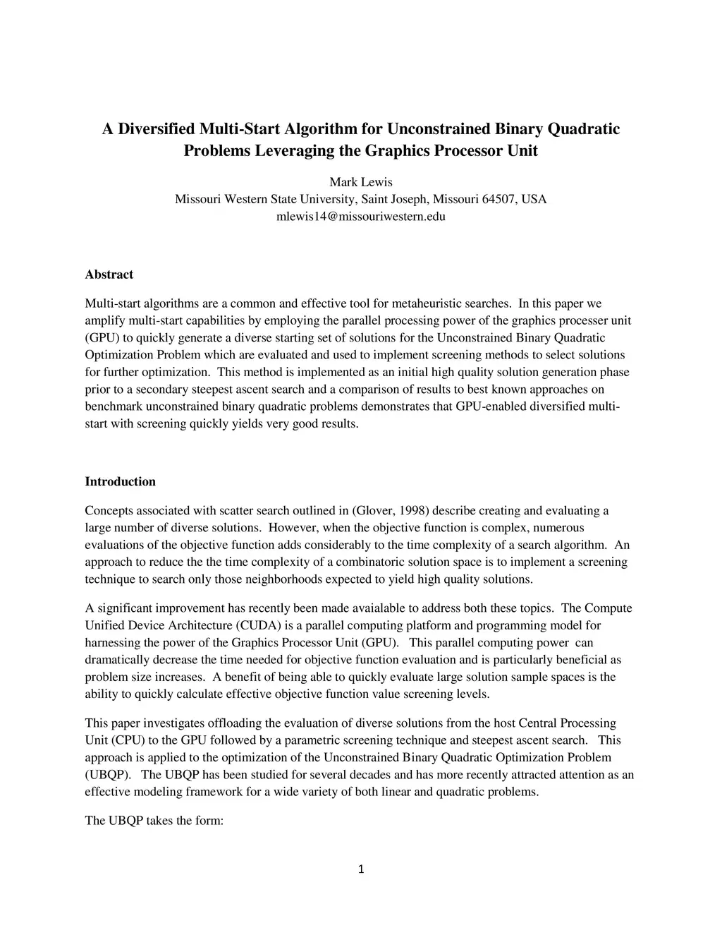 Multi-start algorithms are a common and effective tool for metaheuristic searches. In this paper we amplify multi-start capabilities by employing the parallel processing power of the graphics processer unit (GPU) to quickly generate a diverse starting set of solutions for the Unconstrained Binary Quadratic Optimization Problem which are evaluated and used to implement screening methods to select solutions for further optimization. This method is implemented as an initial high quality solution generation phase prior to a secondary steepest ascent search and a comparison of results to best known approaches on benchmark unconstrained binary quadratic problems demonstrates that GPU-enabled diversified multi-start with screening quickly yields very good results.