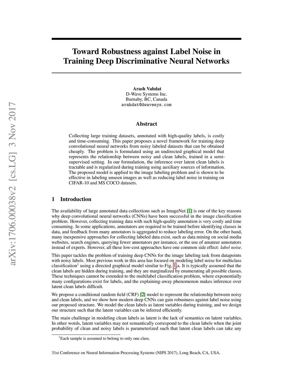 Collecting large training datasets, annotated with high-quality labels, is costly and time-consuming. This paper proposes a novel framework for training deep convolutional neural networks from noisy labeled datasets that can be obtained cheaply. The problem is formulated using an undirected graphical model that represents the relationship between noisy and clean labels, trained in a semi-supervised setting. In our formulation, the inference over latent clean labels is tractable and is regularized during training using auxiliary sources of information. The proposed model is applied to the image labeling problem and is shown to be effective in labeling unseen images as well as reducing label noise in training on CIFAR-10 and MS COCO datasets.