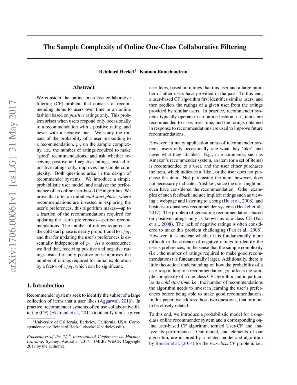 We consider the online one-class collaborative filtering (CF) problem that consists of recommending items to users over time in an online fashion based on positive ratings only. This problem arises when users respond only occasionally to a recommendation with a positive rating, and never with a negative one. We study the impact of the probability of a user responding to a recommendation, p_f, on the sample complexity, i.e., the number of ratings required to make `good' recommendations, and ask whether receiving positive and negative ratings, instead of positive ratings only, improves the sample complexity. Both questions arise in the design of recommender systems. We introduce a simple probabilistic user model, and analyze the performance of an online user-based CF algorithm. We prove that after an initial cold start phase, where recommendations are invested in exploring the user's preferences, this algorithm makes---up to a fraction of the recommendations required for updating the user's preferences---perfect recommendations. The number of ratings required for the cold start phase is nearly proportional to 1/p_f, and that for updating the user's preferences is essentially independent of p_f. As a consequence we find that, receiving positive and negative ratings instead of only positive ones improves the number of ratings required for initial exploration by a factor of 1/p_f, which can be significant.