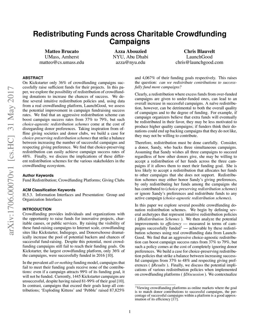 On Kickstarter only 36% of crowdfunding campaigns successfully raise sufficient funds for their projects. In this paper, we explore the possibility of redistribution of crowdfunding donations to increase the chances of success. We define several intuitive redistribution policies and, using data from a real crowdfunding platform, LaunchGood, we assess the potential improvement in campaign fundraising success rates. We find that an aggressive redistribution scheme can boost campaign success rates from 37% to 79%, but such choice-agnostic redistribution schemes come at the cost of disregarding donor preferences. Taking inspiration from offline giving societies and donor clubs, we build a case for choice preserving redistribution schemes that strike a balance between increasing the number of successful campaigns and respecting giving preference. We find that choice-preserving redistribution can easily achieve campaign success rates of 48%. Finally, we discuss the implications of these different redistribution schemes for the various stakeholders in the crowdfunding ecosystem.