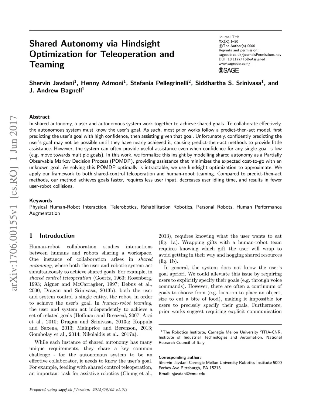 Shared Autonomy via Hindsight Optimization for Teleoperation and Teaming