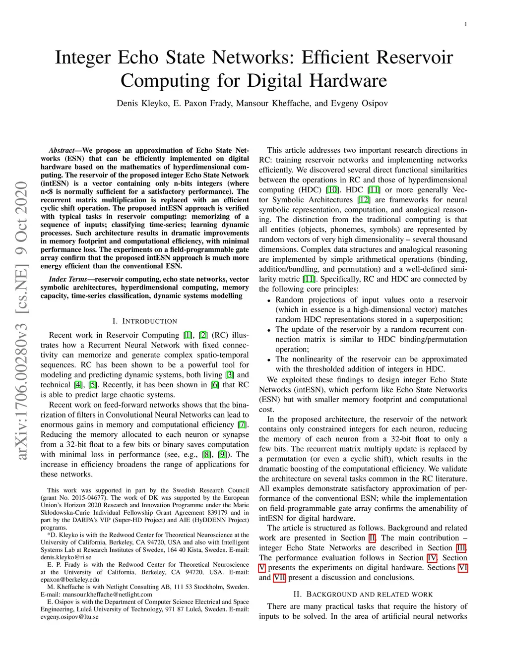 We propose an approximation of Echo State Networks (ESN) that can be efficiently implemented on digital hardware based on the mathematics of hyperdimensional computing. The reservoir of the proposed integer Echo State Network (intESN) is a vector containing only n-bits integers (where n<8 is normally sufficient for a satisfactory performance). The recurrent matrix multiplication is replaced with an efficient cyclic shift operation. The proposed intESN approach is verified with typical tasks in reservoir computing: memorizing of a sequence of inputs; classifying time-series; learning dynamic processes. Such architecture results in dramatic improvements in memory footprint and computational efficiency, with minimal performance loss. The experiments on a field-programmable gate array confirm that the proposed intESN approach is much more energy efficient than the conventional ESN.