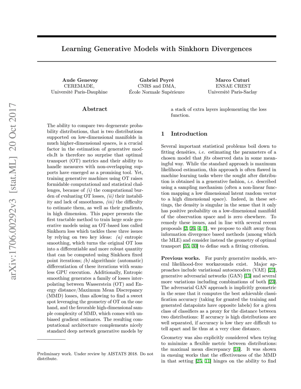 The ability to compare two degenerate probability distributions (i.e. two probability distributions supported on two distinct low-dimensional manifolds living in a much higher-dimensional space) is a crucial problem arising in the estimation of generative models for high-dimensional observations such as those arising in computer vision or natural language. It is known that optimal transport metrics can represent a cure for this problem, since they were specifically designed as an alternative to information divergences to handle such problematic scenarios. Unfortunately, training generative machines using OT raises formidable computational and statistical challenges, because of (i) the computational burden of evaluating OT losses, (ii) the instability and lack of smoothness of these losses, (iii) the difficulty to estimate robustly these losses and their gradients in high dimension. This paper presents the first tractable computational method to train large scale generative models using an optimal transport loss, and tackles both these issues by relying on two key ideas: (a) entropic smoothing, which turns the original OT loss into one that can be computed using Sinkhorn fixed point iterations; (b) algorithmic (automatic) differentiation of these iterations. These two approximations result in a robust and differentiable approximation of the OT loss with streamlined GPU execution. Entropic smoothing generates a family of losses interpolating between Wasserstein (OT) and Maximum Mean Discrepancy (MMD), thus allowing to find a sweet spot leveraging the geometry of OT and the favorable high-dimensional sample complexity of MMD which comes with unbiased gradient estimates. The resulting computational architecture complements nicely standard deep network generative models by a stack of extra layers implementing the loss function.