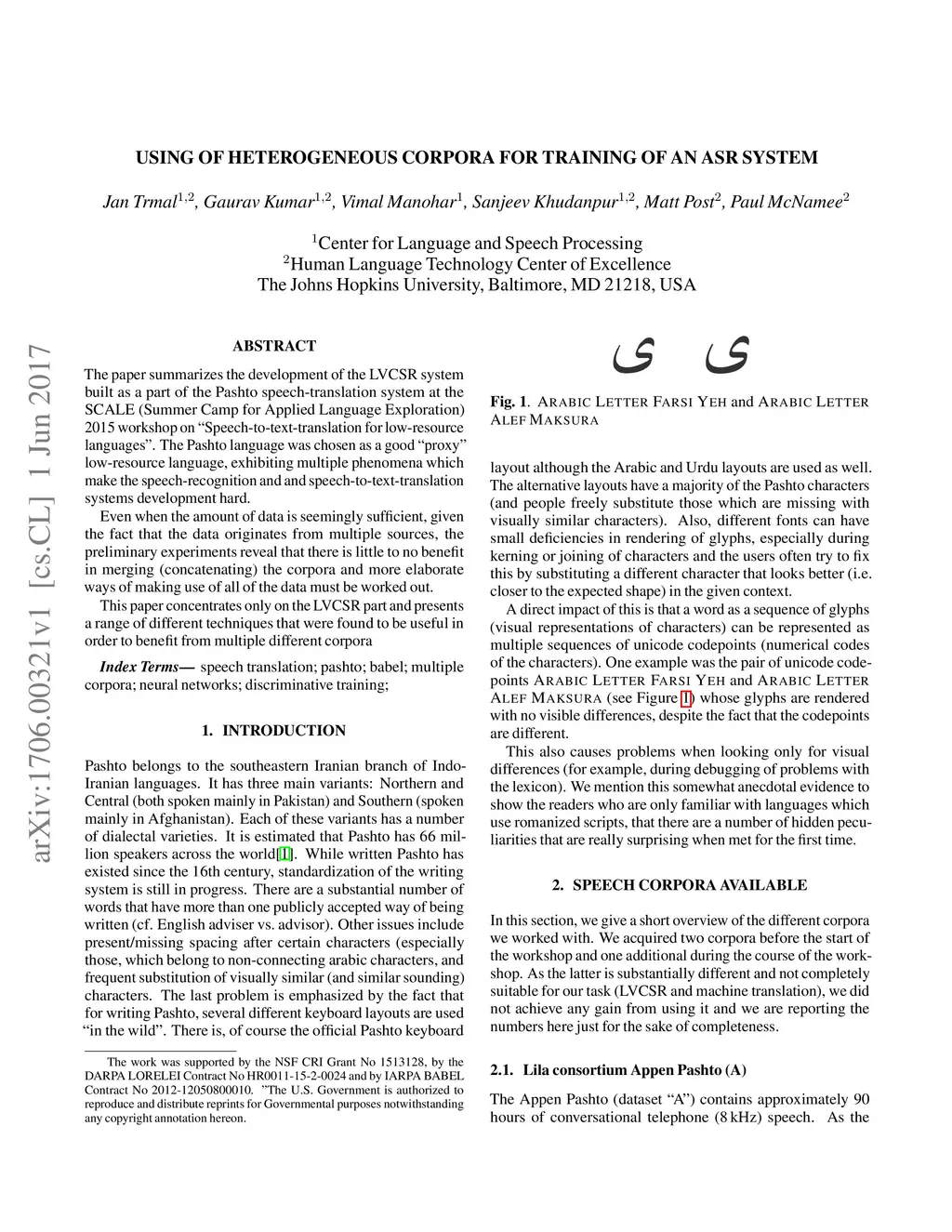 The paper summarizes the development of the LVCSR system built as a part of the Pashto speech-translation system at the SCALE (Summer Camp for Applied Language Exploration) 2015 workshop on "Speech-to-text-translation for low-resource languages". The Pashto language was chosen as a good "proxy" low-resource language, exhibiting multiple phenomena which make the speech-recognition and and speech-to-text-translation systems development hard. Even when the amount of data is seemingly sufficient, given the fact that the data originates from multiple sources, the preliminary experiments reveal that there is little to no benefit in merging (concatenating) the corpora and more elaborate ways of making use of all of the data must be worked out. This paper concentrates only on the LVCSR part and presents a range of different techniques that were found to be useful in order to benefit from multiple different corpora