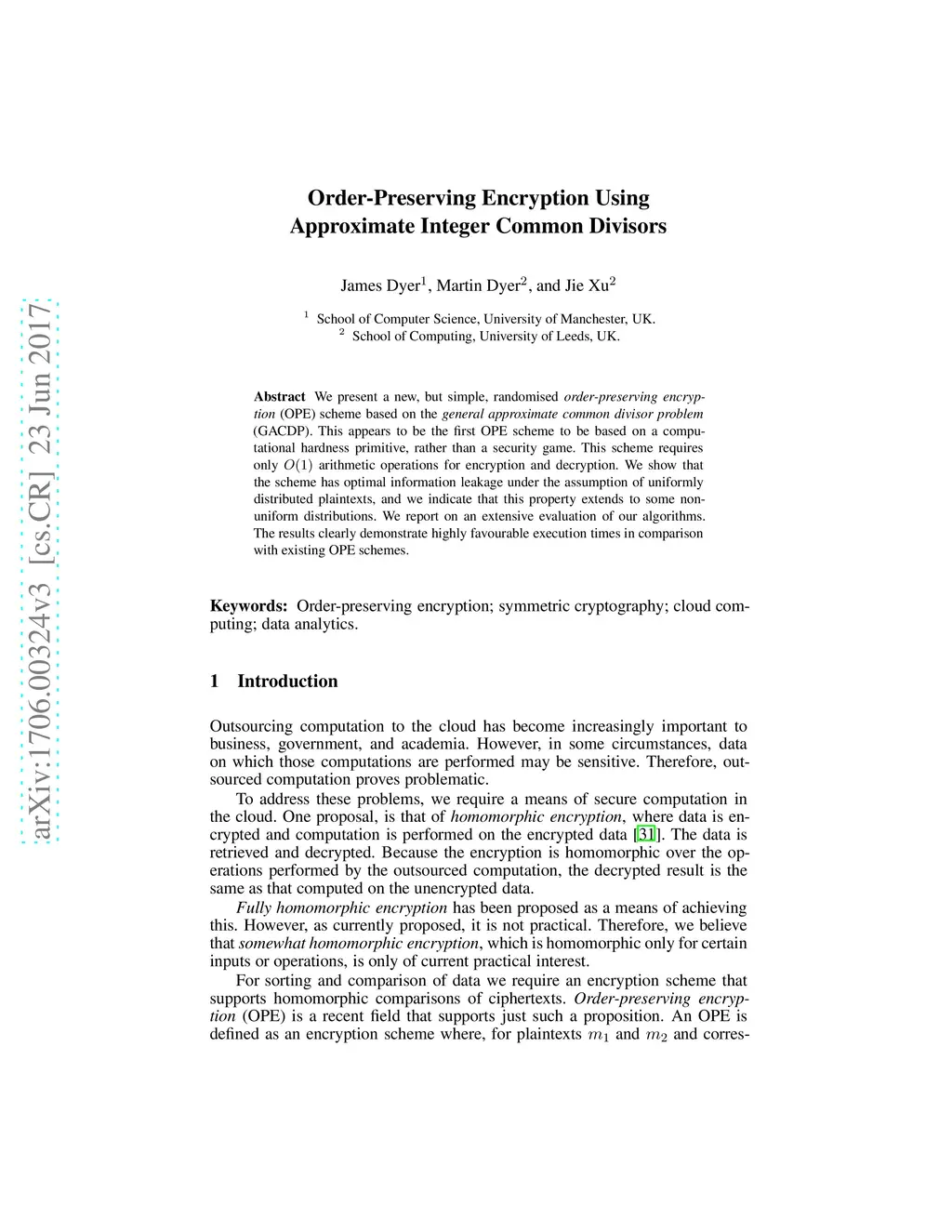 Order-Preserving Encryption Using Approximate Integer Common Divisors