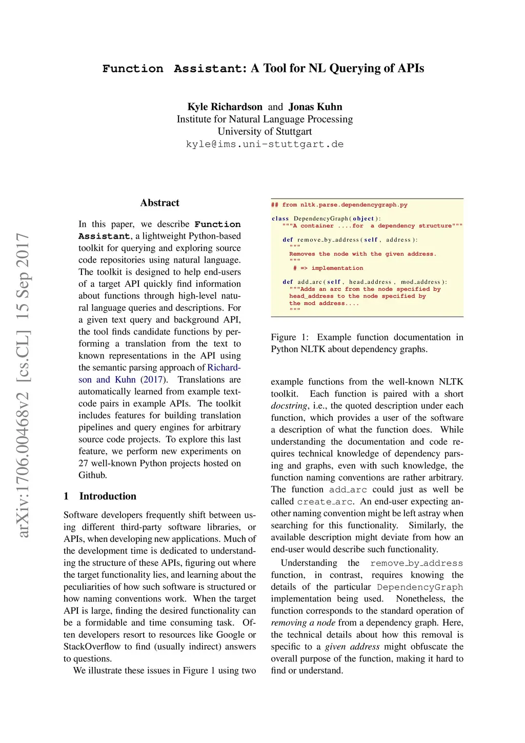 In this paper, we describe Function Assistant, a lightweight Python-based toolkit for querying and exploring source code repositories using natural language. The toolkit is designed to help end-users of a target API quickly find information about functions through high-level natural language queries and descriptions. For a given text query and background API, the tool finds candidate functions by performing a translation from the text to known representations in the API using the semantic parsing approach of Richardson and Kuhn (2017). Translations are automatically learned from example text-code pairs in example APIs. The toolkit includes features for building translation pipelines and query engines for arbitrary source code projects. To explore this last feature, we perform new experiments on 27 well-known Python projects hosted on Github.