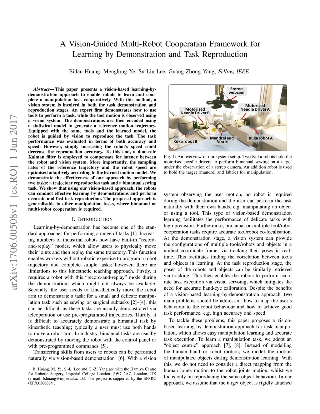 This paper presents a vision-based learning-by-demonstration approach to enable robots to learn and complete a manipulation task cooperatively. With this method, a vision system is involved in both the task demonstration and reproduction stages. An expert first demonstrates how to use tools to perform a task, while the tool motion is observed using a vision system. The demonstrations are then encoded using a statistical model to generate a reference motion trajectory. Equipped with the same tools and the learned model, the robot is guided by vision to reproduce the task. The task performance was evaluated in terms of both accuracy and speed. However, simply increasing the robot's speed could decrease the reproduction accuracy. To this end, a dual-rate Kalman filter is employed to compensate for latency between the robot and vision system. More importantly, the sampling rates of the reference trajectory and the robot speed are optimised adaptively according to the learned motion model. We demonstrate the effectiveness of our approach by performing two tasks: a trajectory reproduction task and a bimanual sewing task. We show that using our vision-based approach, the robots can conduct effective learning by demonstrations and perform accurate and fast task reproduction. The proposed approach is generalisable to other manipulation tasks, where bimanual or multi-robot cooperation is required.