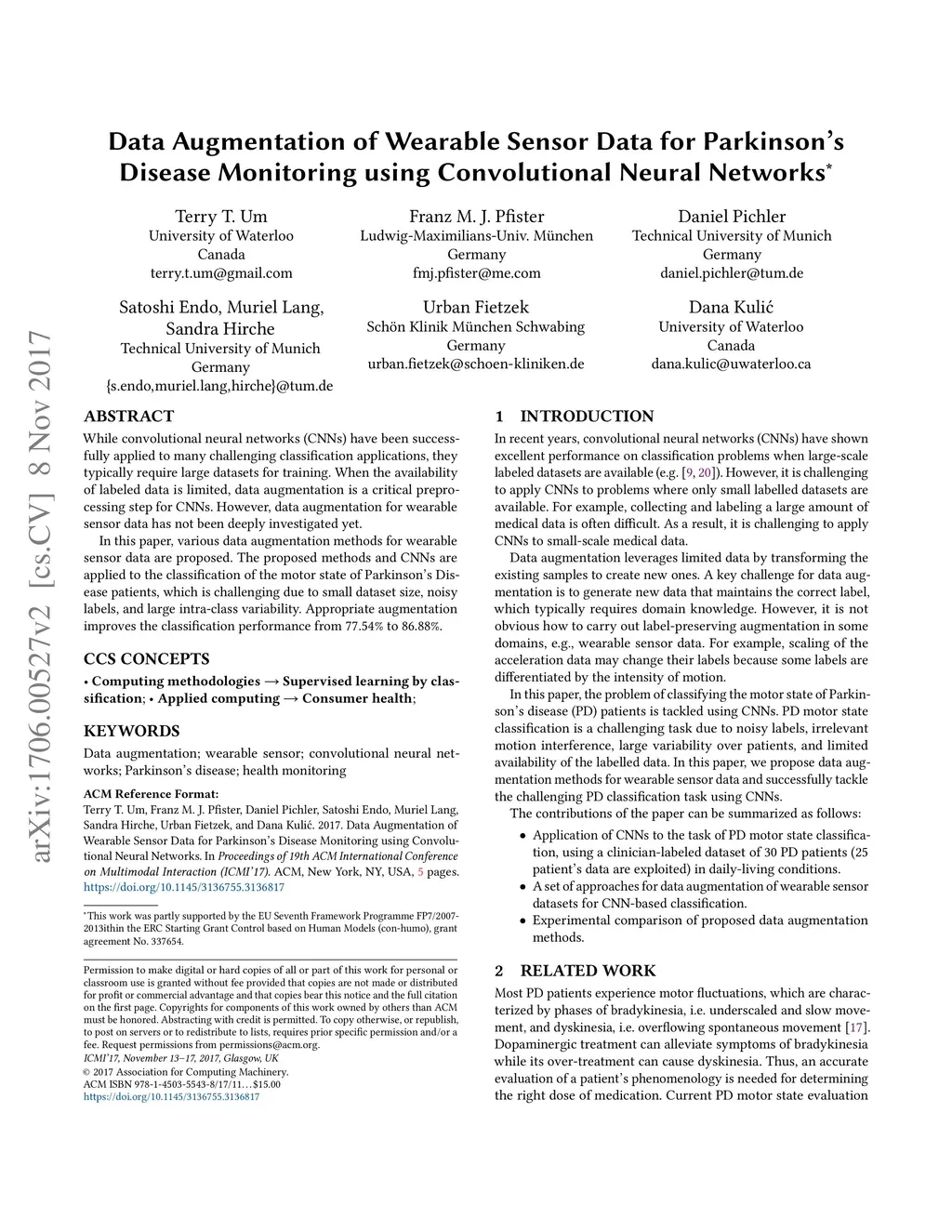 While convolutional neural networks (CNNs) have been successfully applied to many challenging classification applications, they typically require large datasets for training. When the availability of labeled data is limited, data augmentation is a critical preprocessing step for CNNs. However, data augmentation for wearable sensor data has not been deeply investigated yet. In this paper, various data augmentation methods for wearable sensor data are proposed. The proposed methods and CNNs are applied to the classification of the motor state of Parkinson's Disease patients, which is challenging due to small dataset size, noisy labels, and large intra-class variability. Appropriate augmentation improves the classification performance from 77.54\% to 86.88\%.
