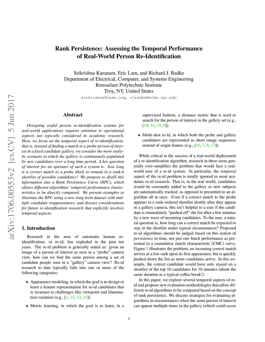 Designing useful person re-identification systems for real-world applications requires attention to operational aspects not typically considered in academic research. Here, we focus on the temporal aspect of re-identification; that is, instead of finding a match to a probe person of interest in a fixed candidate gallery, we consider the more realistic scenario in which the gallery is continuously populated by new candidates over a long time period. A key question of interest for an operator of such a system is: how long is a correct match to a probe likely to remain in a rank-k shortlist of possible candidates? We propose to distill this information into a Rank Persistence Curve (RPC), which allows different algorithms' temporal performance characteristics to be directly compared. We present examples to illustrate the RPC using a new long-term dataset with multiple candidate reappearances, and discuss considerations for future re-identification research that explicitly involves temporal aspects.